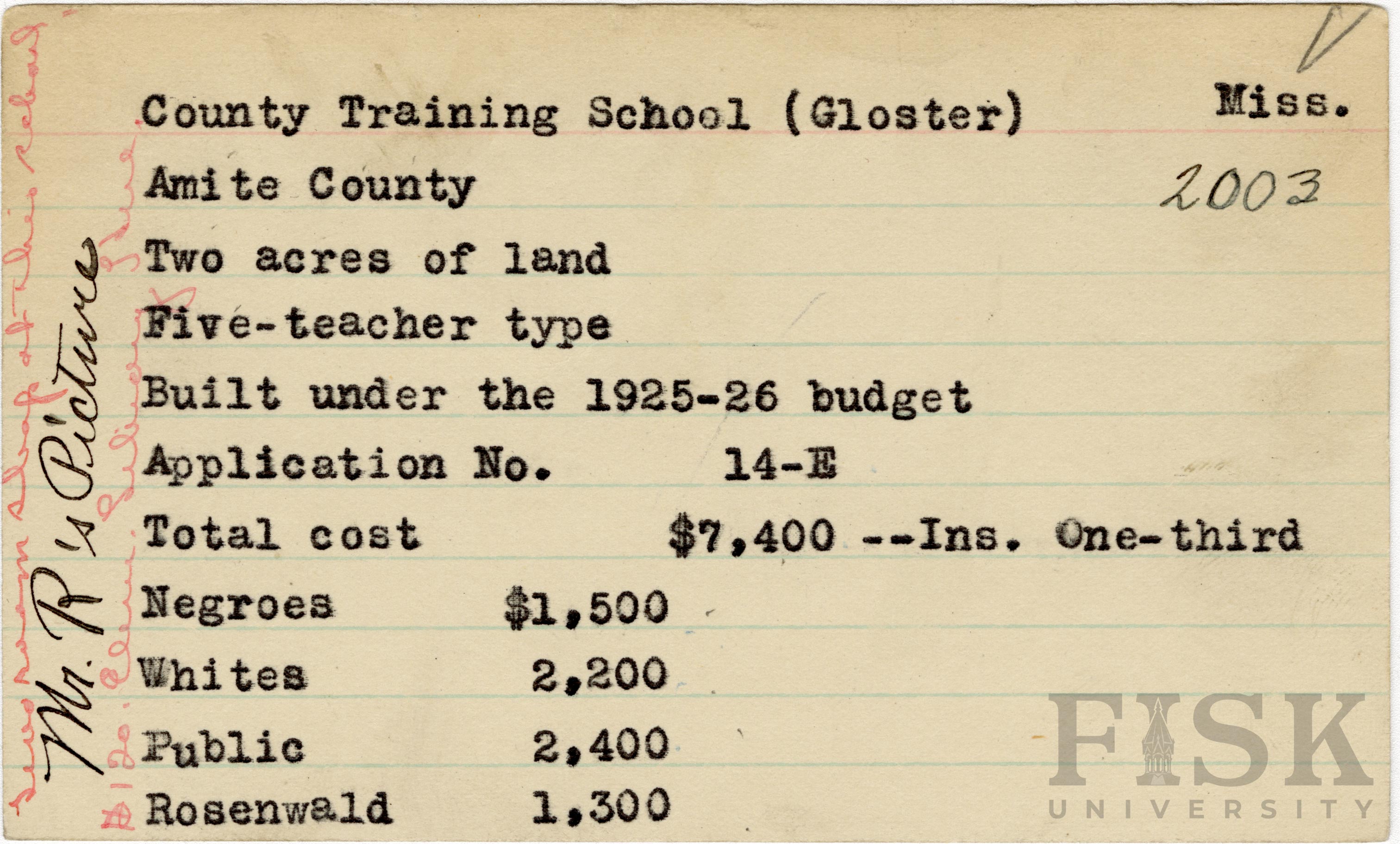 - School card from Rosenwald Fund for County Training School in Amite County, Mississippi with a section added to the budget contributions that says, "Ins. One-third". Handwritten notes on the far left of the card say, "two room shop at this school," "Mr. R's Picture," and "$120 elem library here"