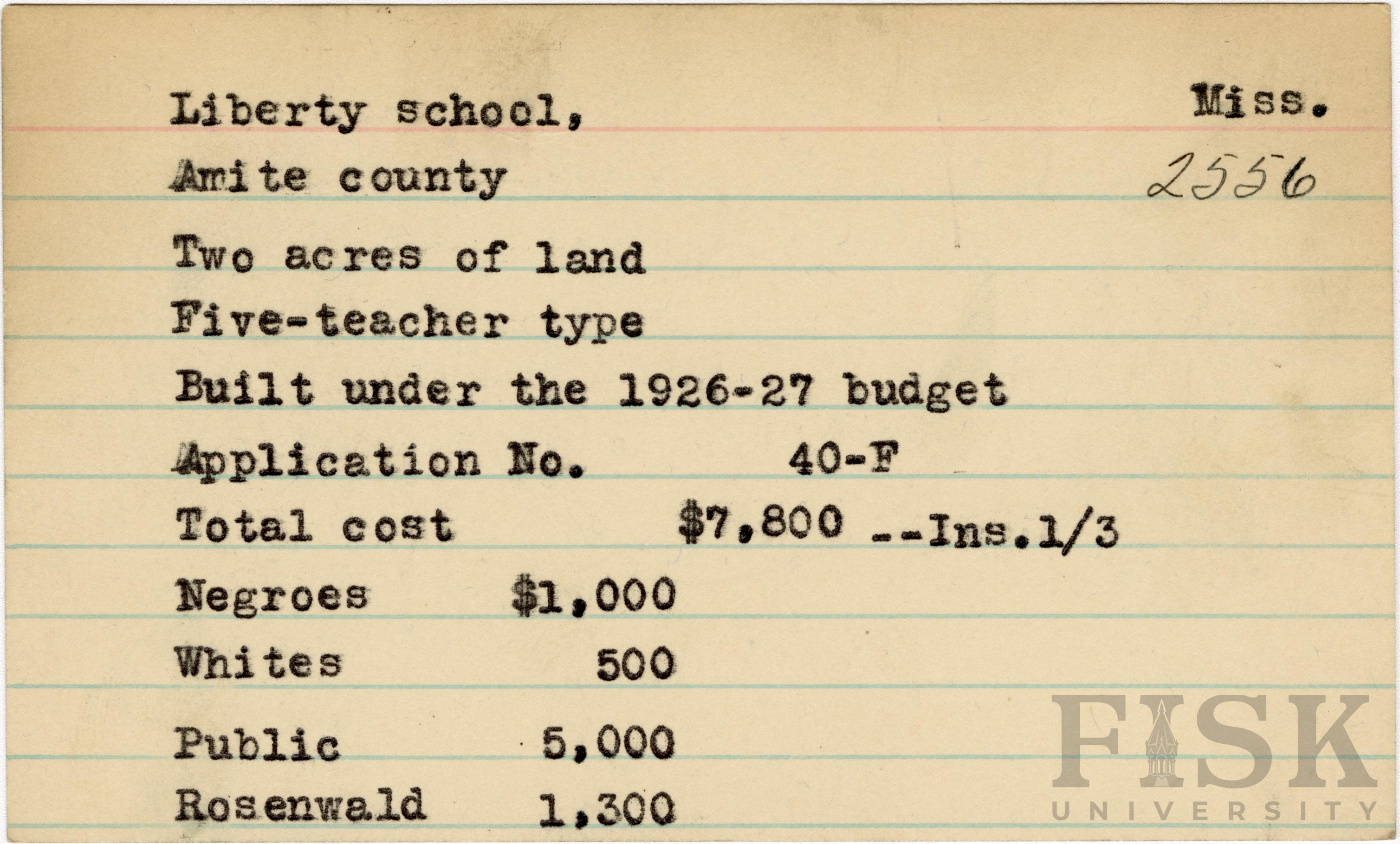 - School card from Rosenwald Fund for Liberty School in Amite County, Mississippi with a section added to the budget contributions that says, "Ins. 1/3"