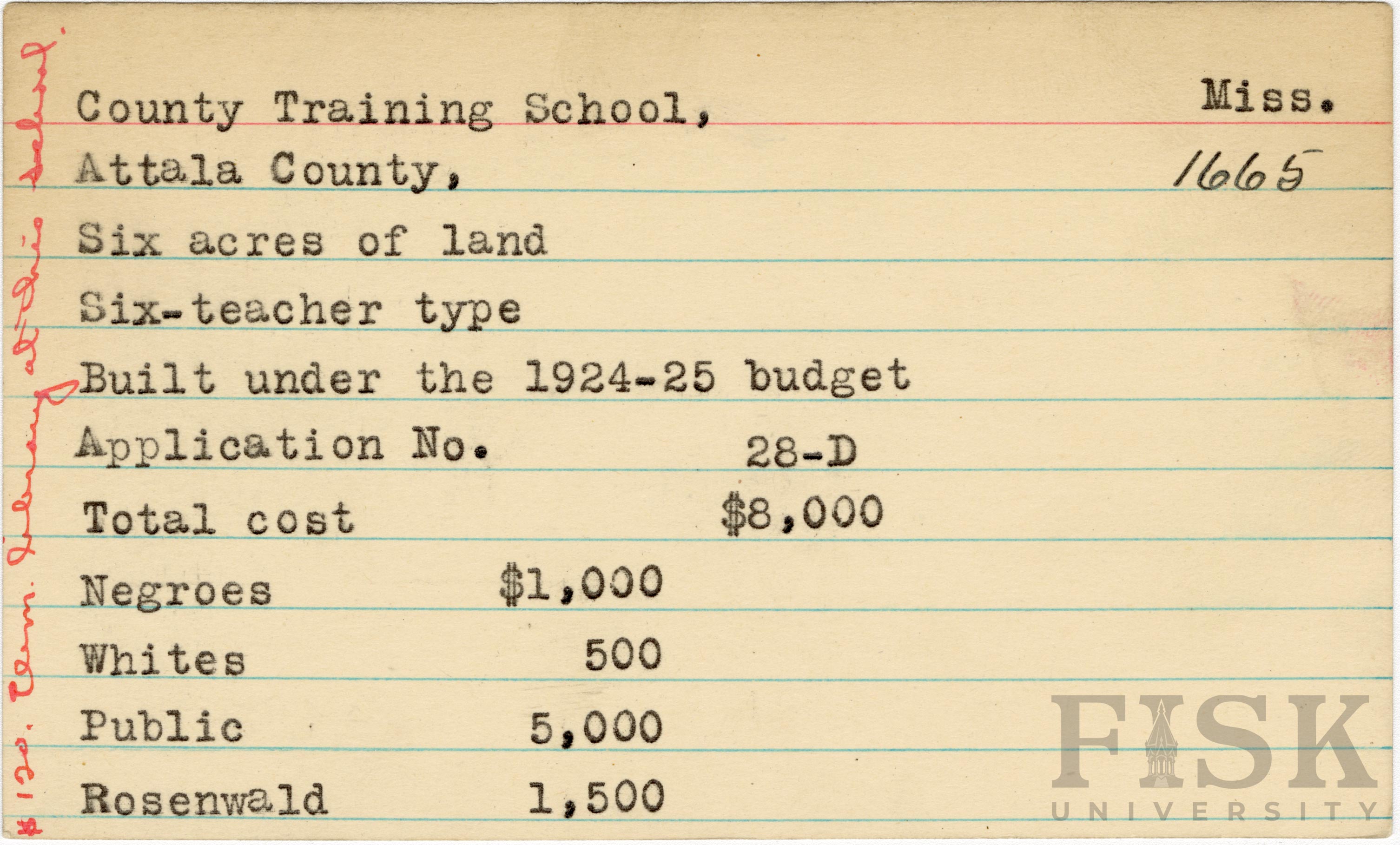 - School card from Rosenwald Fund for County Training School in Attala County, Mississippi with a handwritten note on the far left of the card that says, "$120 elem library at this school"