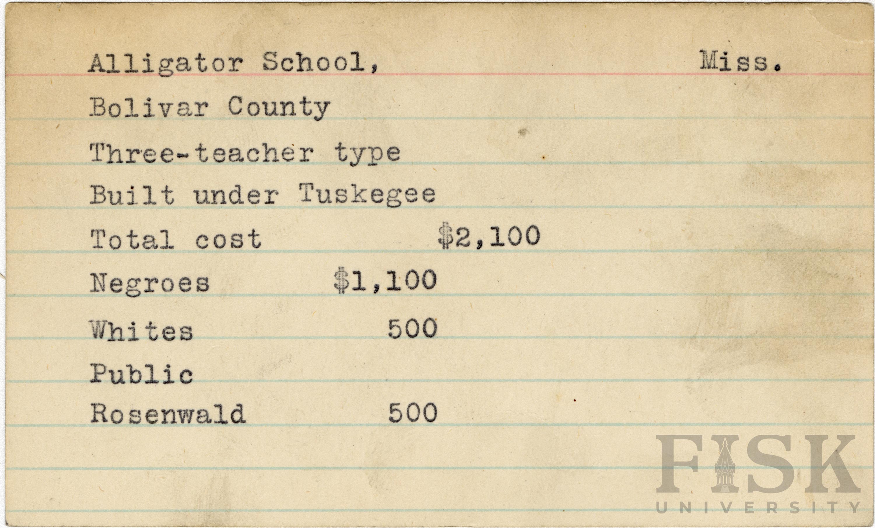 - School card from Rosenwald Fund for Alligator School in Bolivar County, Mississippi