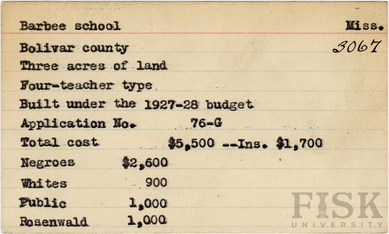 School card from Rosenwald Fund for Barbee School in Bolivar County, Mississippi with a section added to the budget contributions that says, "Ins. $1,700"