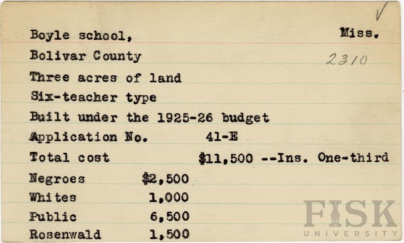 - School card from Rosenwald Fund for Boyle School in Bolivar County, Mississippi with a section added to the budget contributions that says, "Ins. One-third"