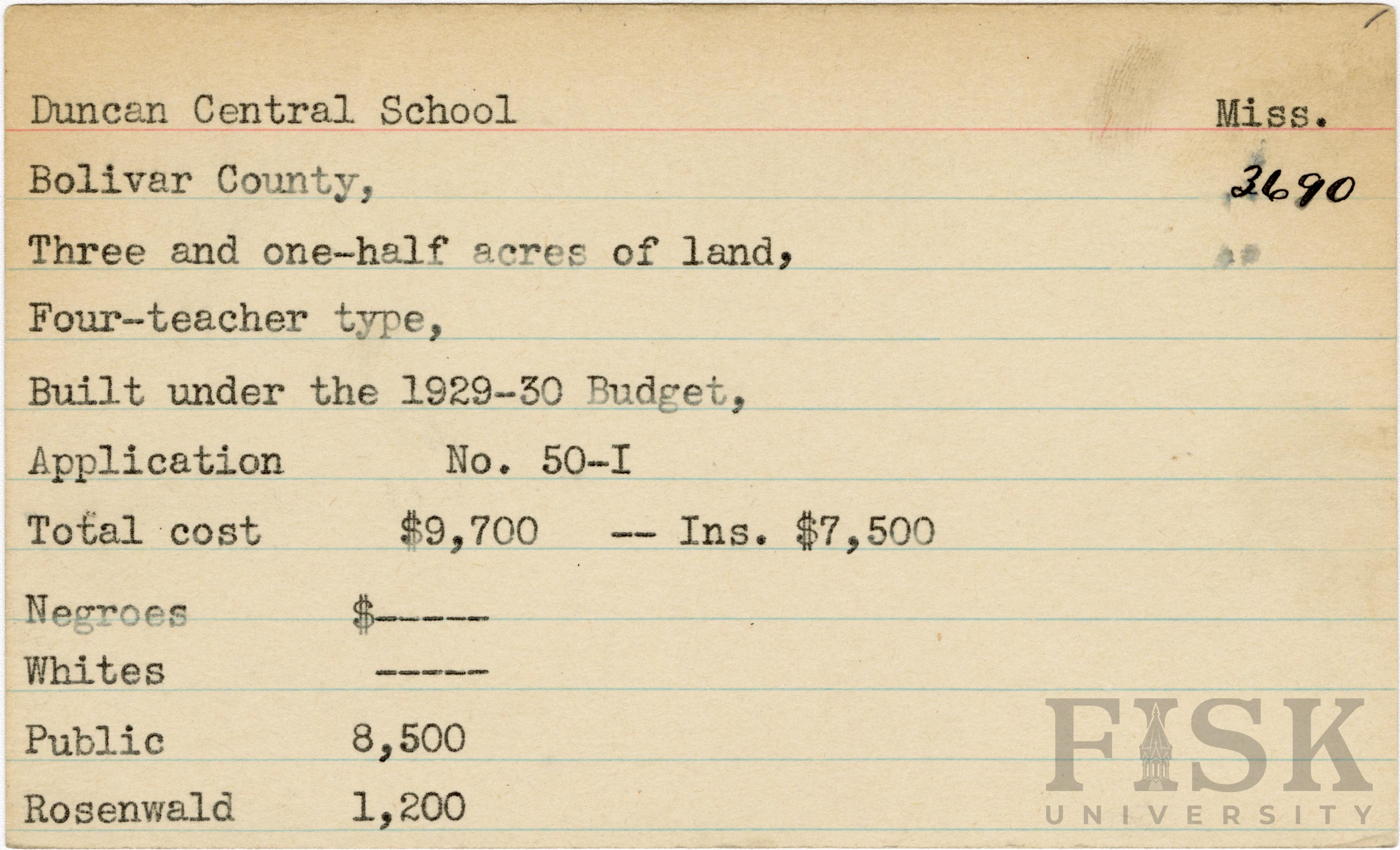 - School card from Rosenwald Fund for Duncan Central School in Bolivar County, Mississippi with a section added to the budget contributions that says, "Ins. $7,500"