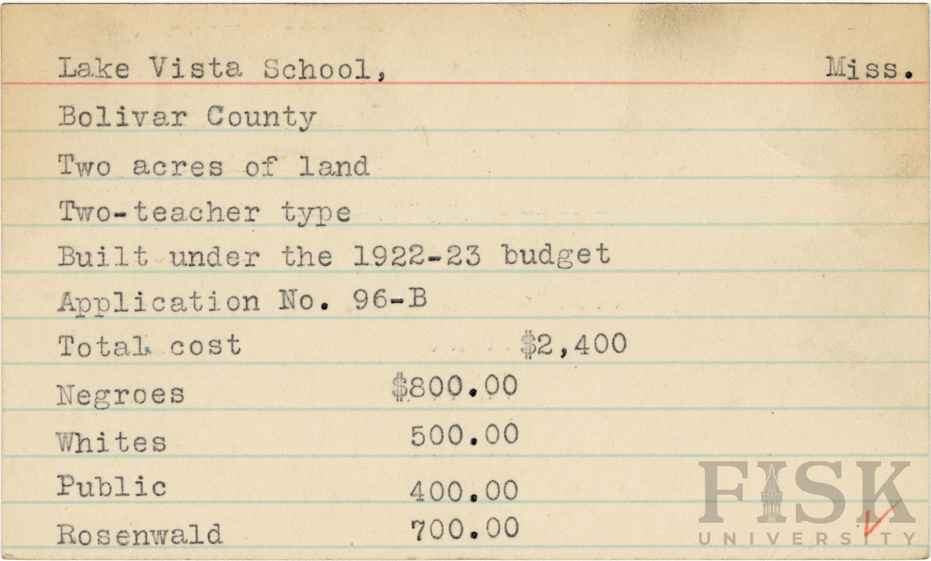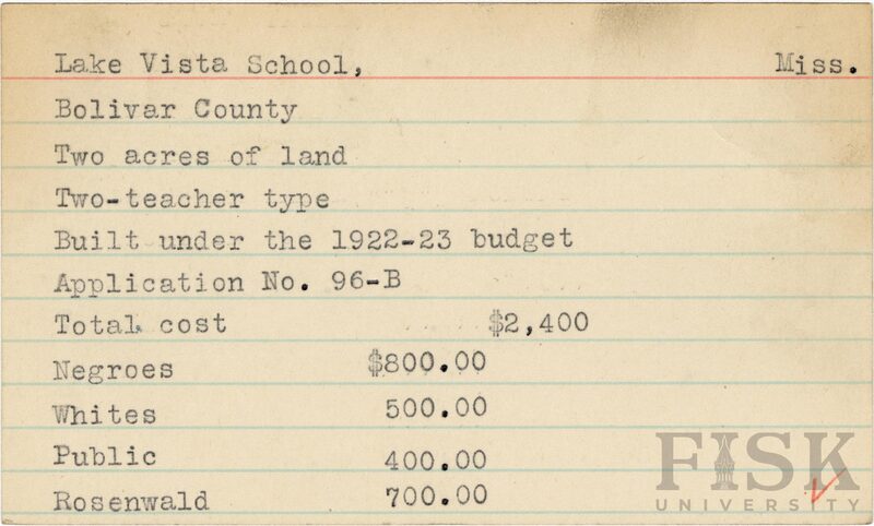 - School card from Rosenwald Fund for Lake Vista School in Bolivar County, Mississippi