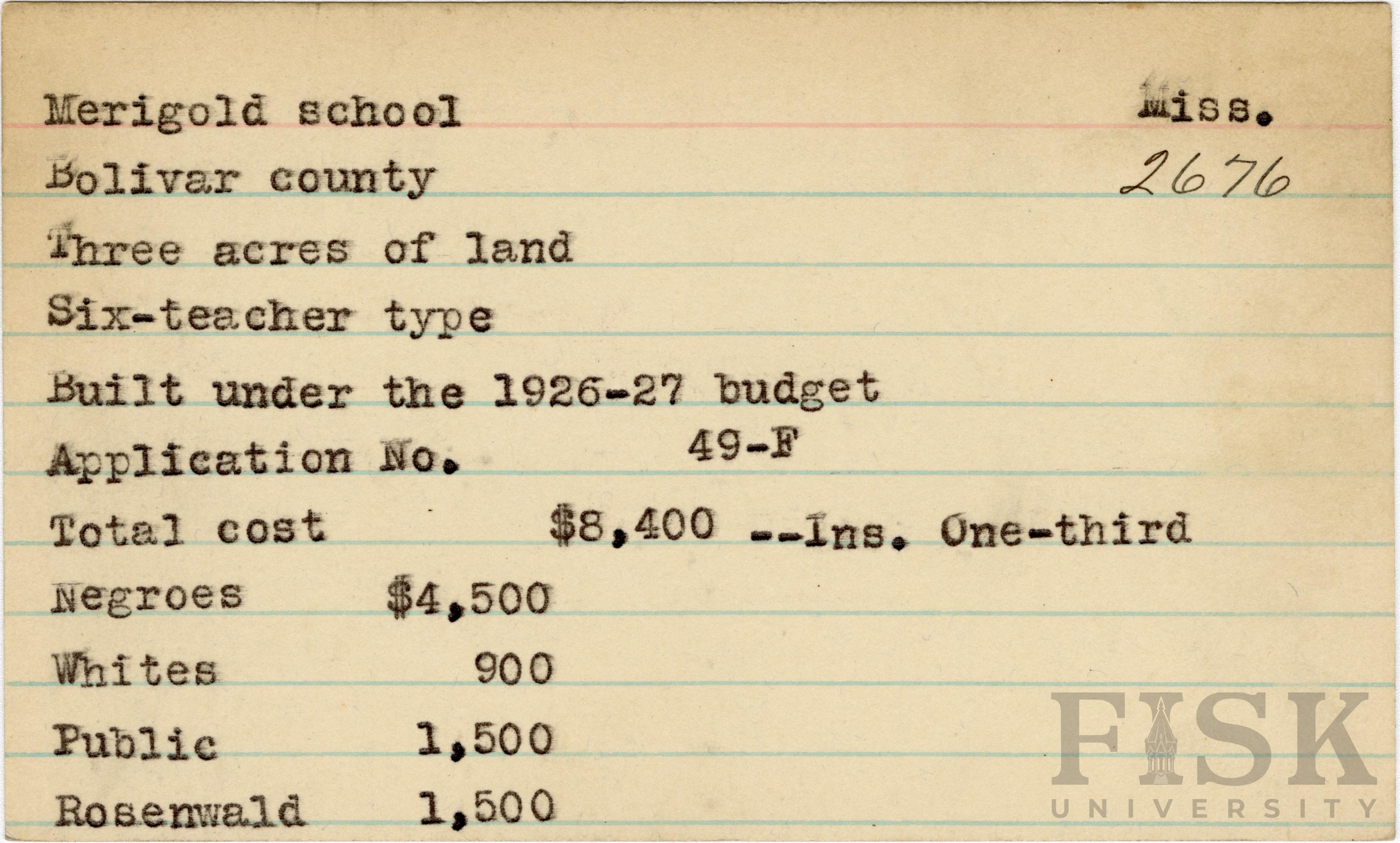 - School card from Rosenwald Fund for Merigold County, Mississippi with a section added to the budget contributions that says, "Ins. One-third"