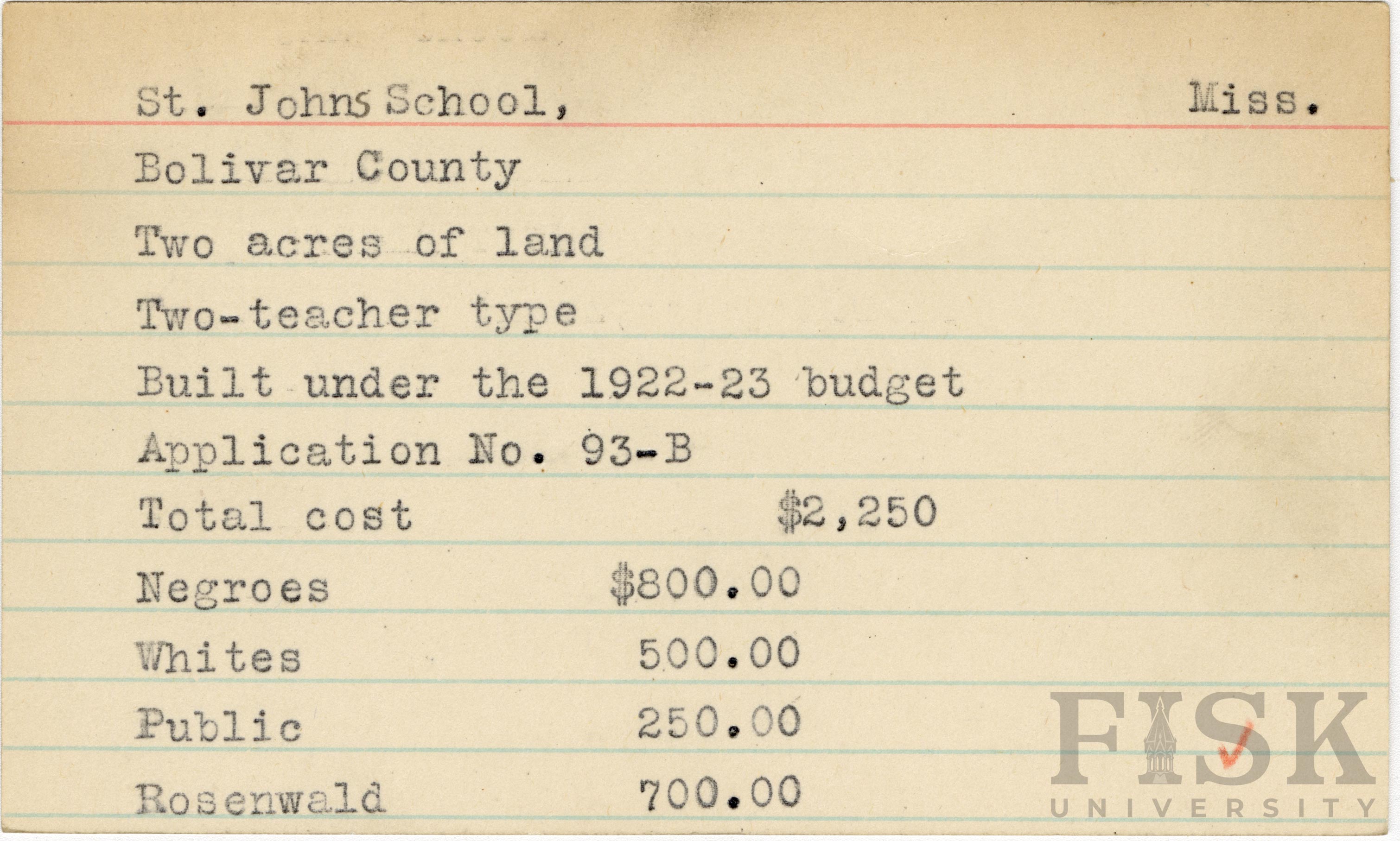 - School card from Rosenwald Fund for St. John's School in Bolivar County, Mississippi