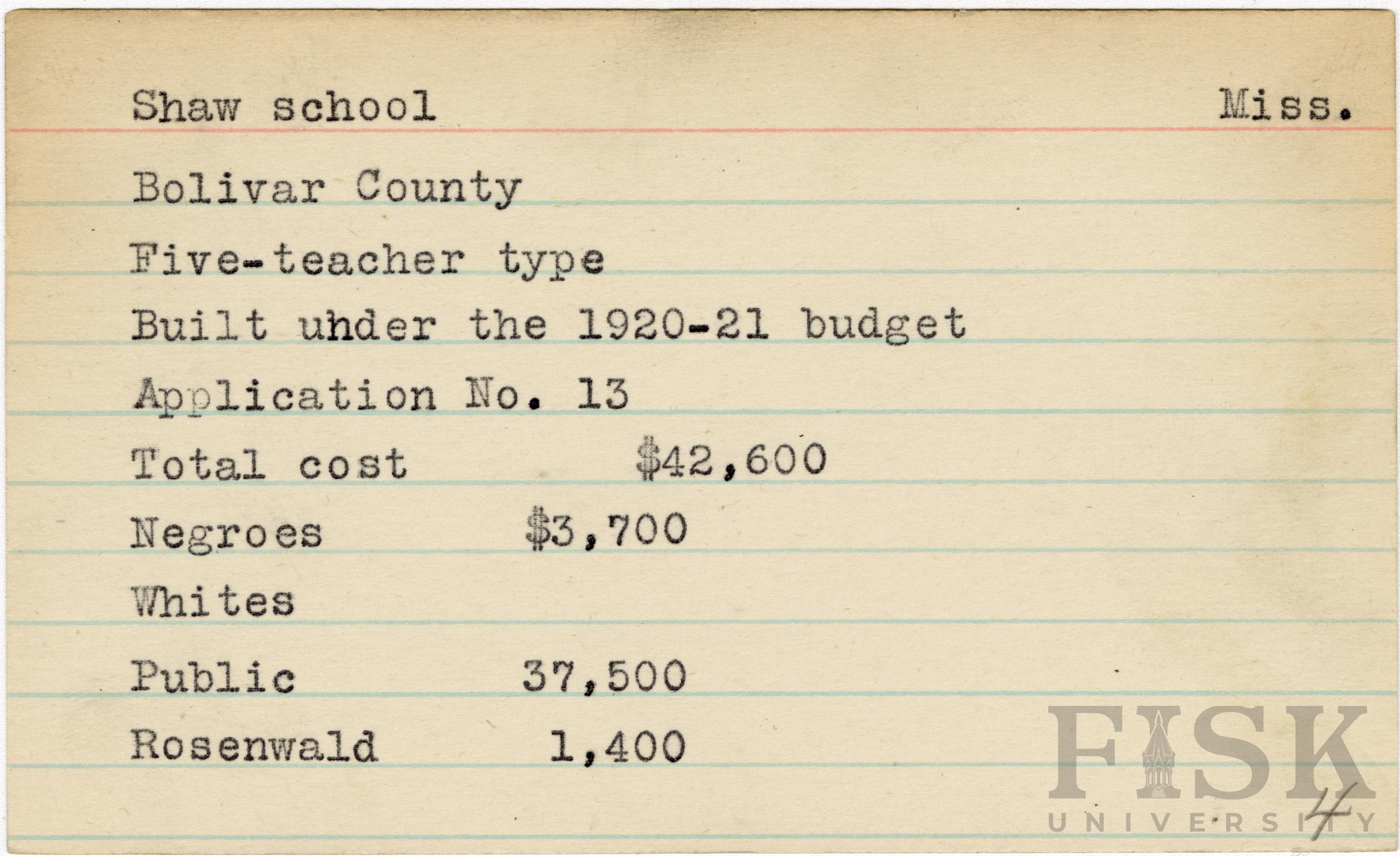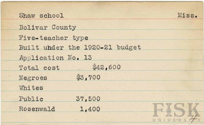 - School card from Rosenwald Fund for Shaw School in Bolivar County, Mississippi