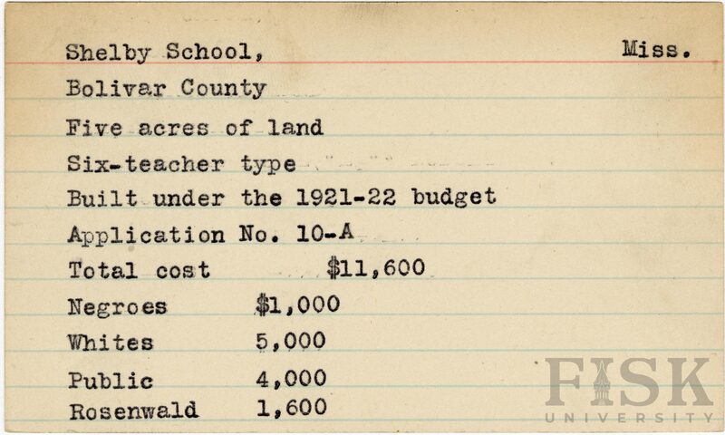 - School card from Rosenwald Fund for Shelby School in Bolivar County, Mississippi