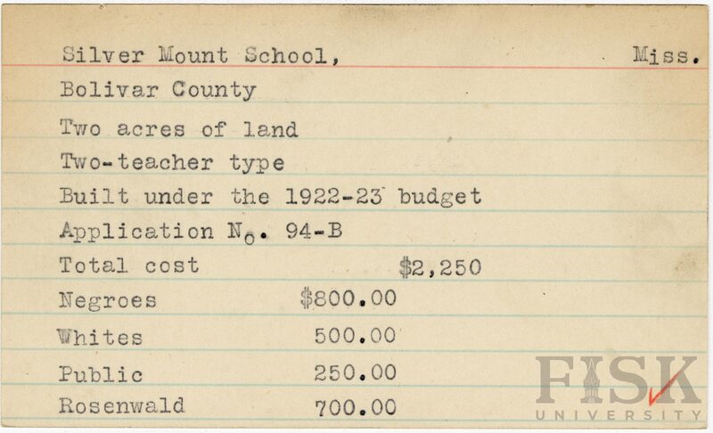 - School card from Rosenwald Fund for Silver Mount School in Bolivar County, Mississippi
