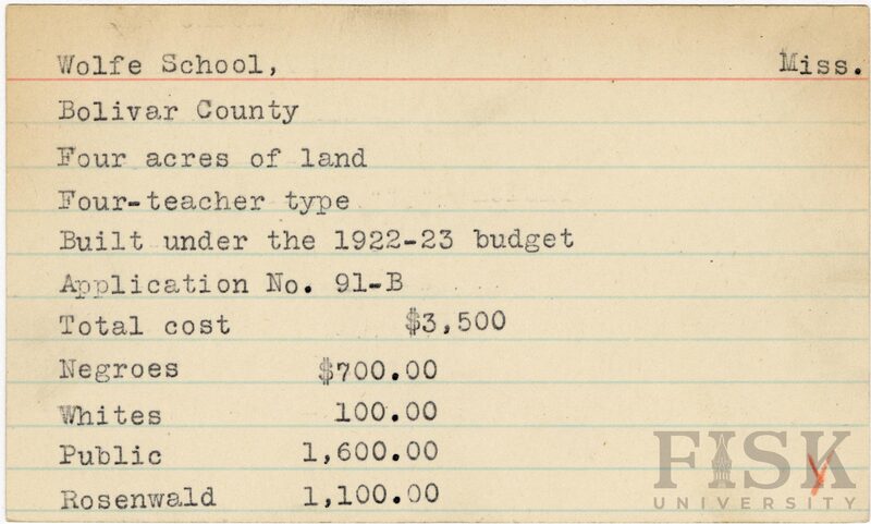 - School card from Rosenwald Fund for Wolfe School in Bolivar County, Mississippi