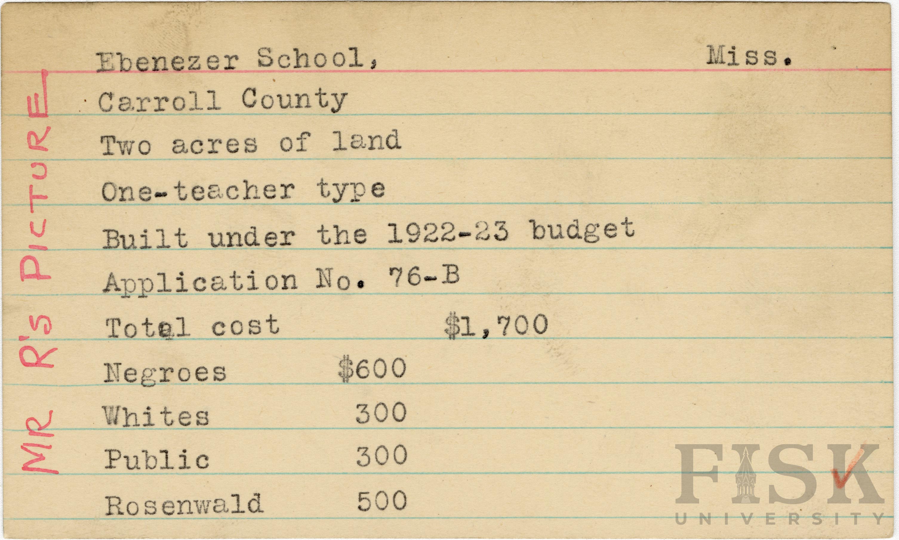 - School card from Rosenwald Fund for Ebenezer School in Carroll County, Mississippi with a handwritten note on the far left of the card that says, "Mr. R's Picture"