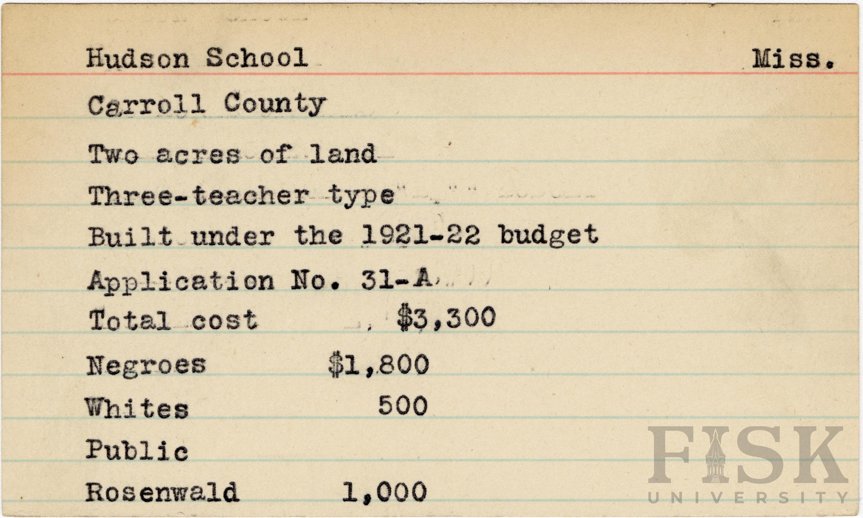 - School card from Rosenwald Fund for Hudson School in Carroll County, Mississippi