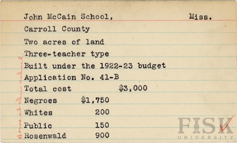 - School card from Rosenwald Fund for John McCain School in Carroll County, Mississippi with a handwritten note on the far left of the card that says, "home at this school"