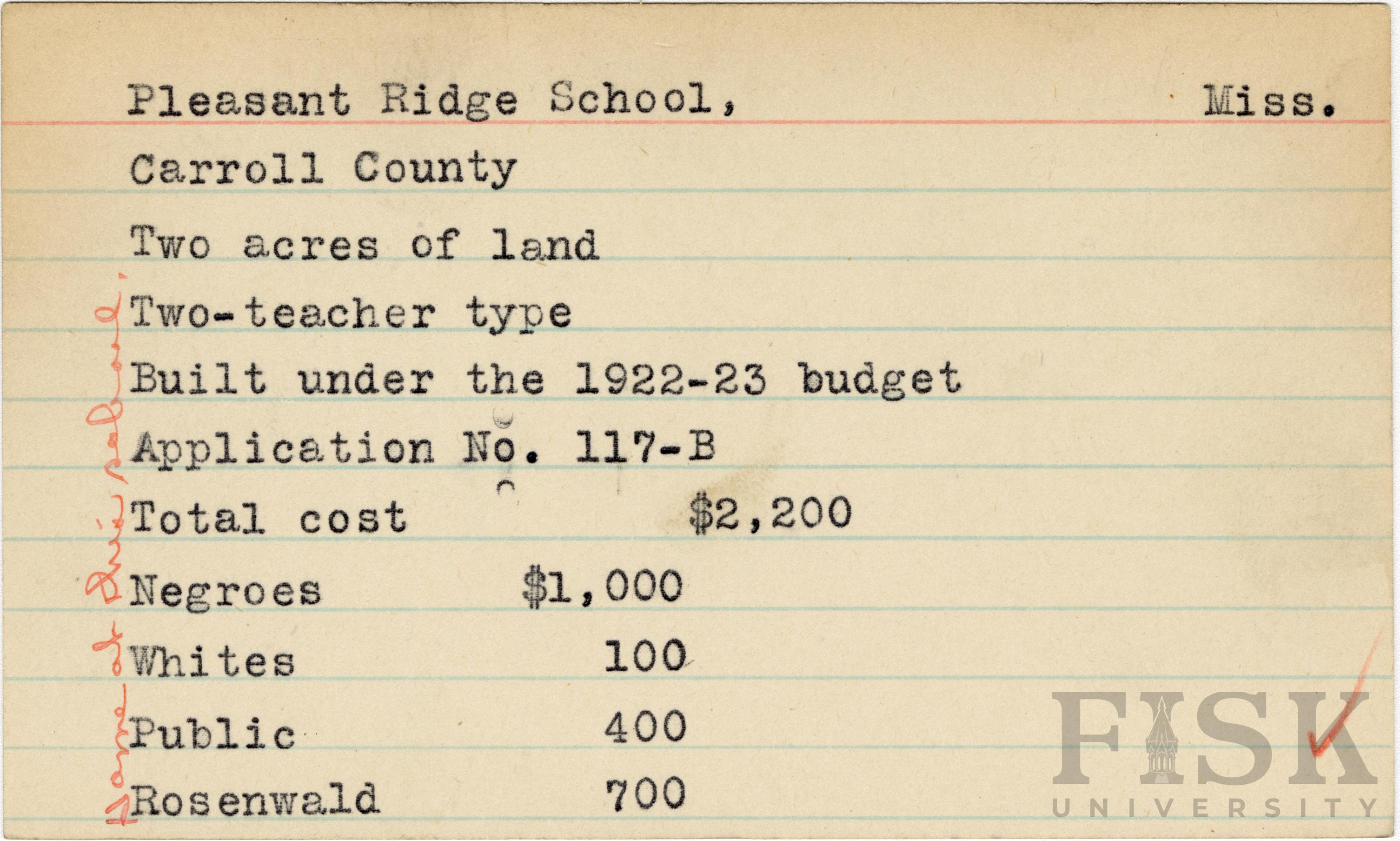 - School card from Rosenwald Fund for Pleasant Ridge School in Carroll County, Mississippi with a handwritten note on the far left of the card that says, "home at this school"