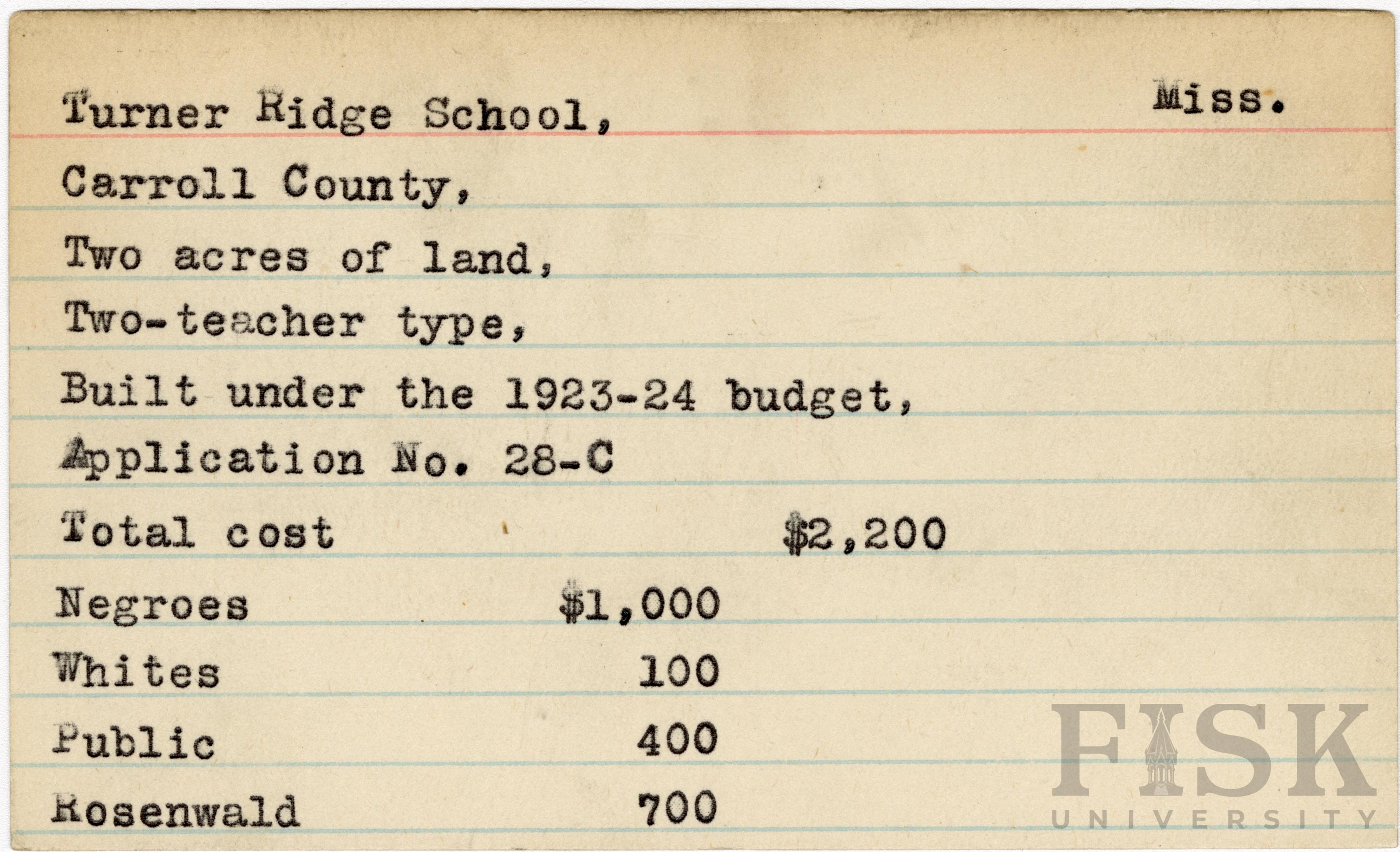 - School card from Rosenwald Fund for Turner Ridge School in Carroll County, Mississippi