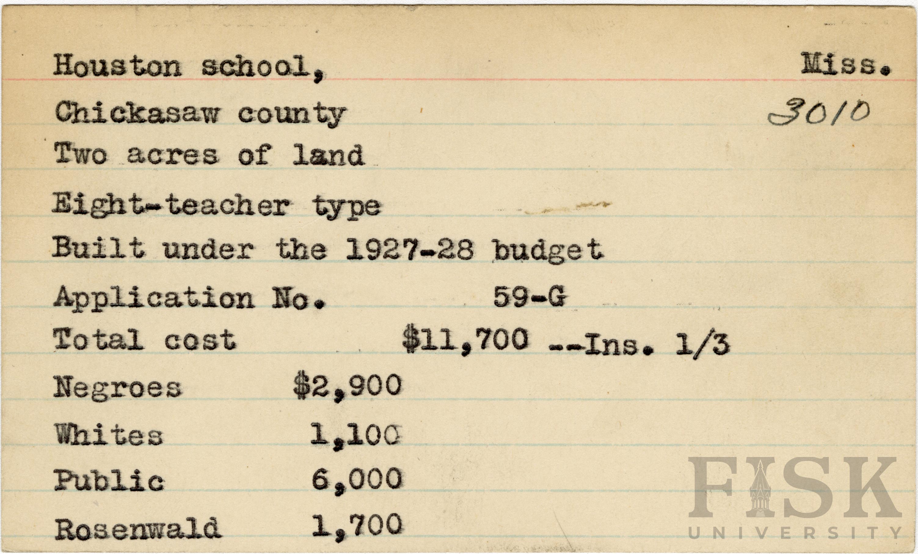 School card from Rosenwald Fund for Houston School in Chickasaw County, Mississippi with a section added to the budget contributions that says, "Ins. 1/3"