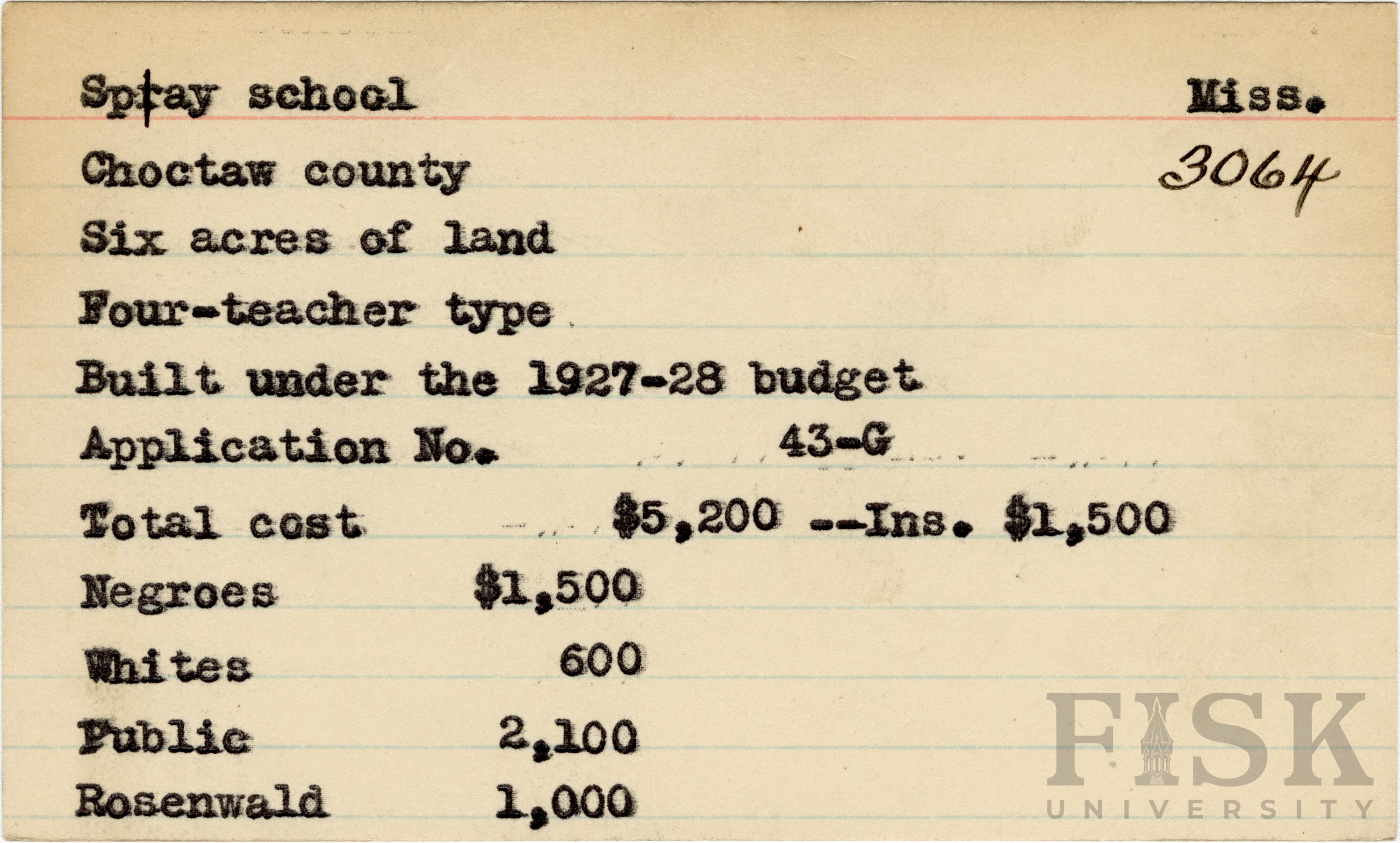 - School card from Rosenwald Fund for Spray School in Choctaw County, Mississippi with a section added to the budget contributions that says, "Ins. $1,500"