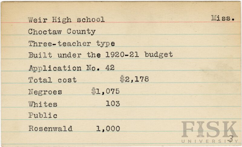 - School card from Rosenwald Fund for Weir High School in Choctaw County, Mississippi