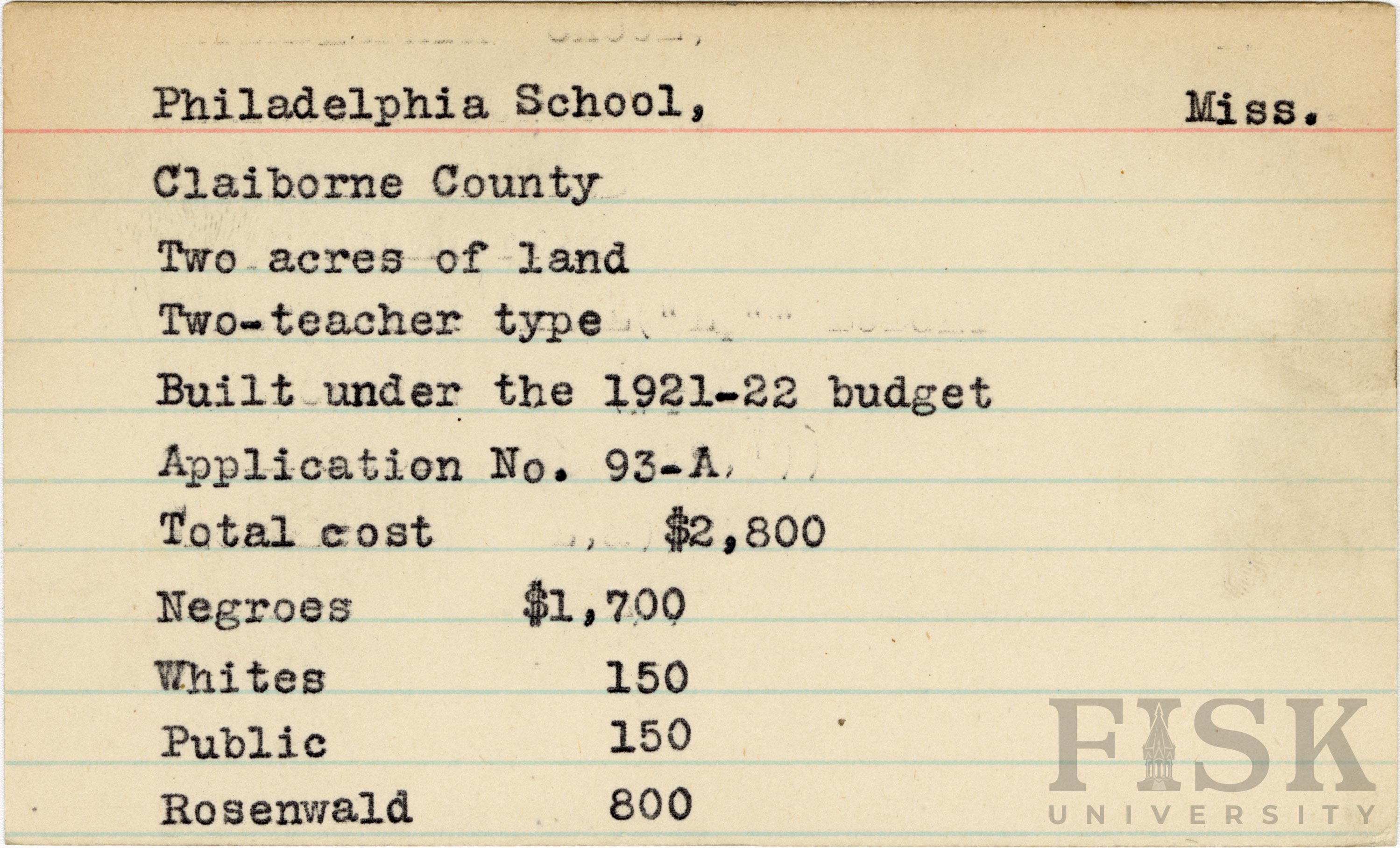 - School card from Rosenwald Fund for Philadelphia School in Claiborne County, Mississippi