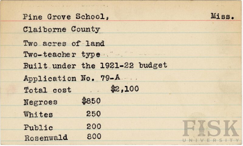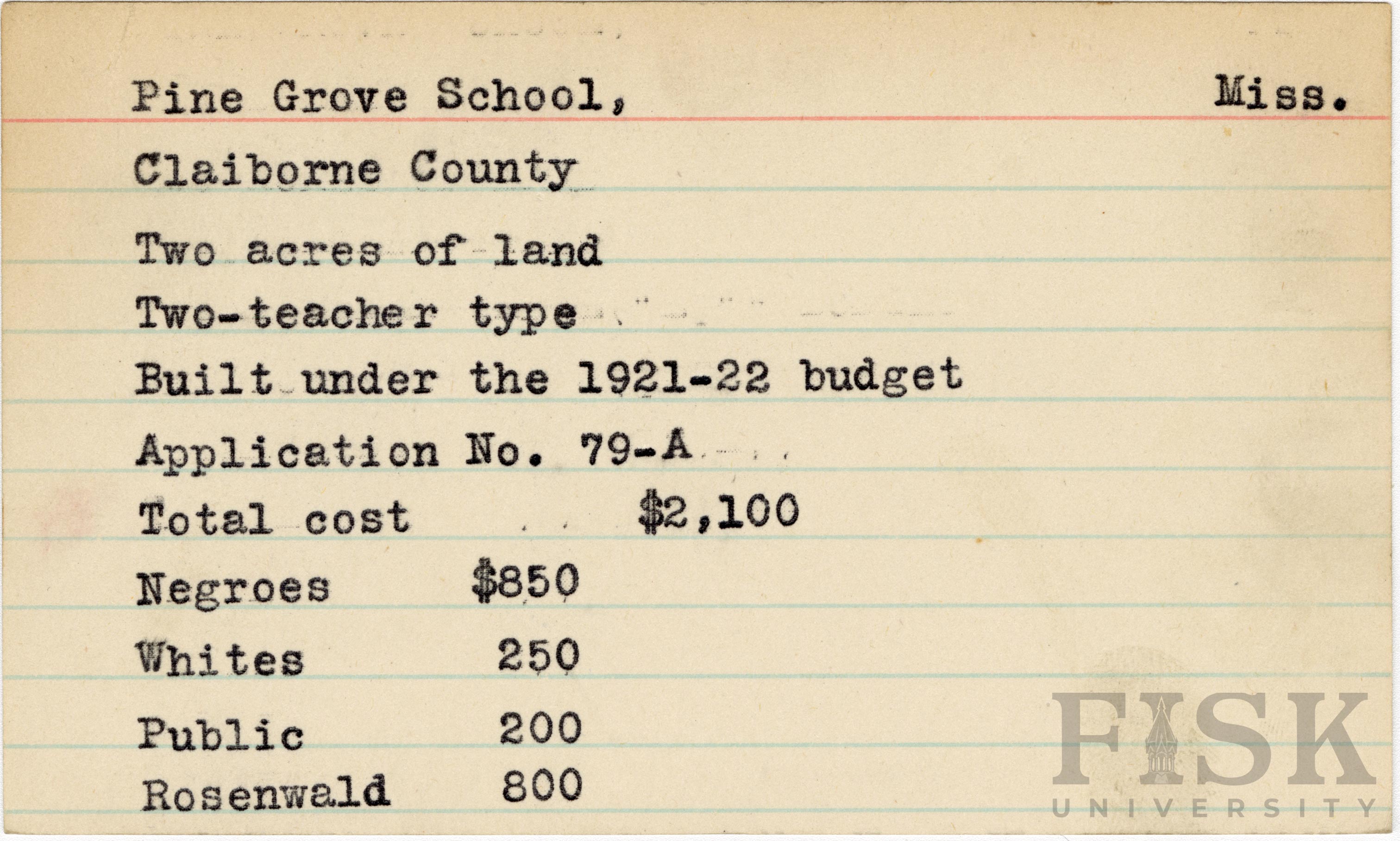 - School card from Rosenwald Fund for Pine Grove School in Claiborne County, Mississippi