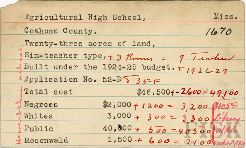 - School card from Rosenwald Fund for Agricultural High School in Coahoma County, Mississippi with handwritten additions to the teacher type, budget year, application number, and budget contribution sections. Handwritten notes on the card say, "home at this school" and "$105.00 library at this school (Exp)"