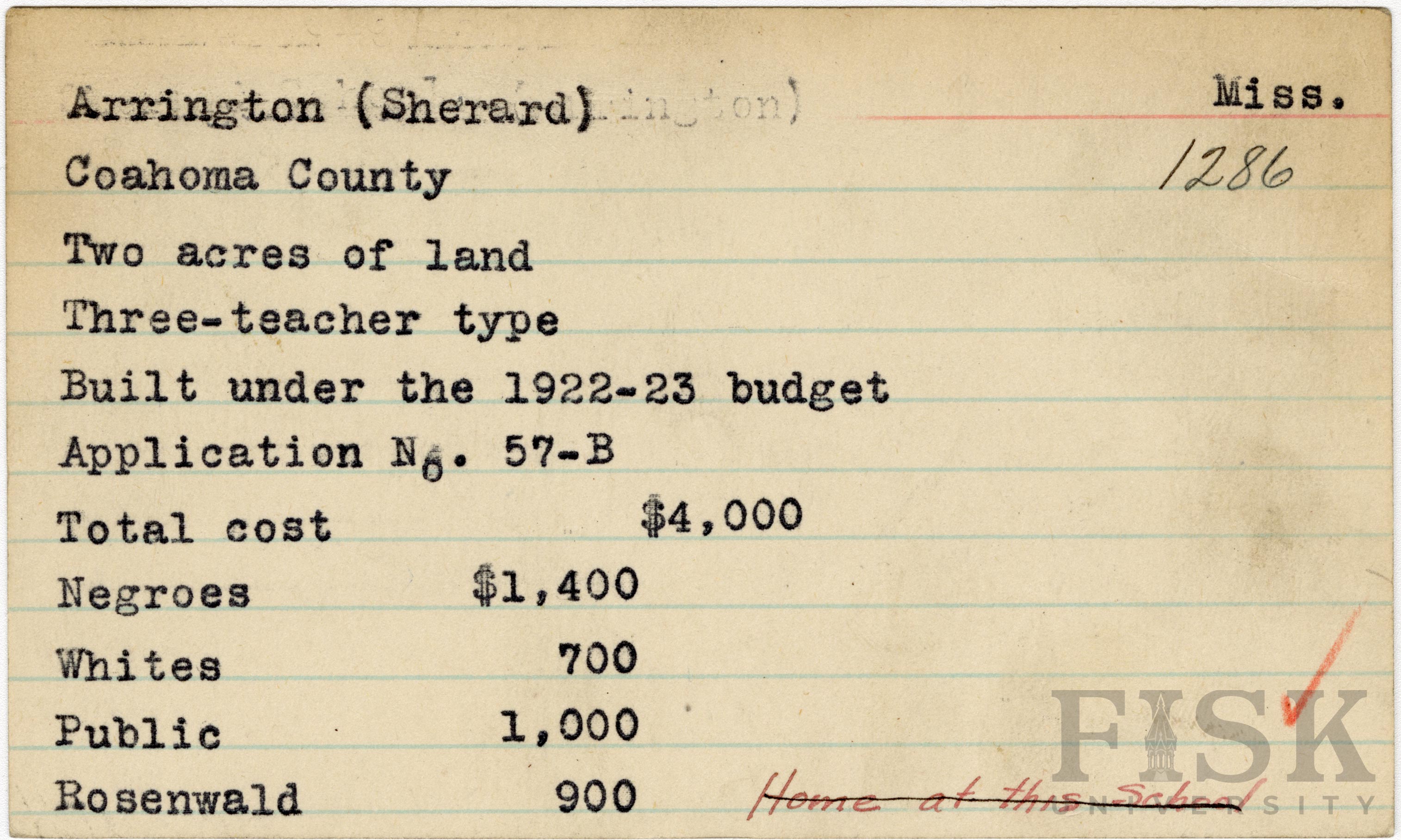- School card from Rosenwald Fund for Arrington School in Coahoma County, Mississippi with a crossed out note that says, "Home at this school"