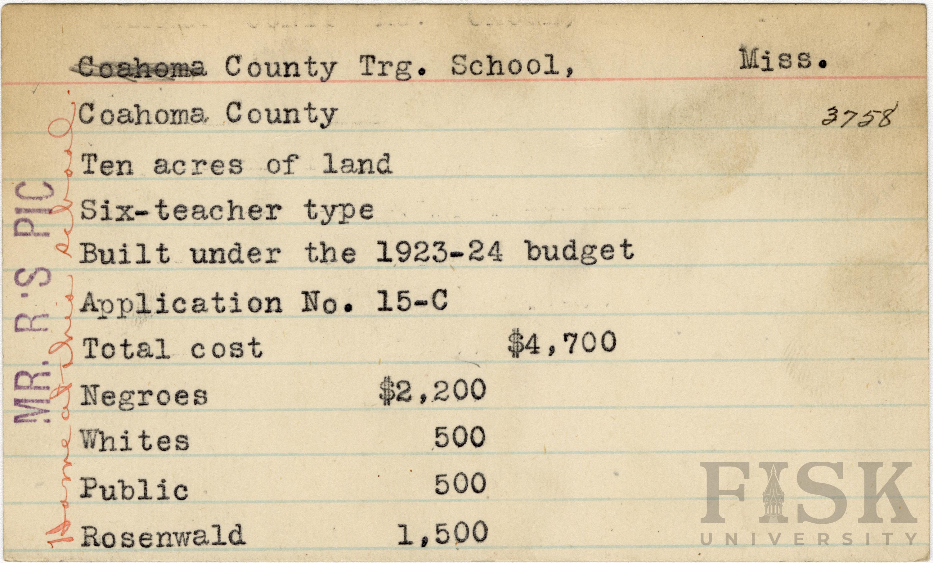 School card from Rosenwald Fund for County Training School in Coahoma County, Mississippi with notes on the far left of the card that say, "Mr. R's Pic" and "home at this school"