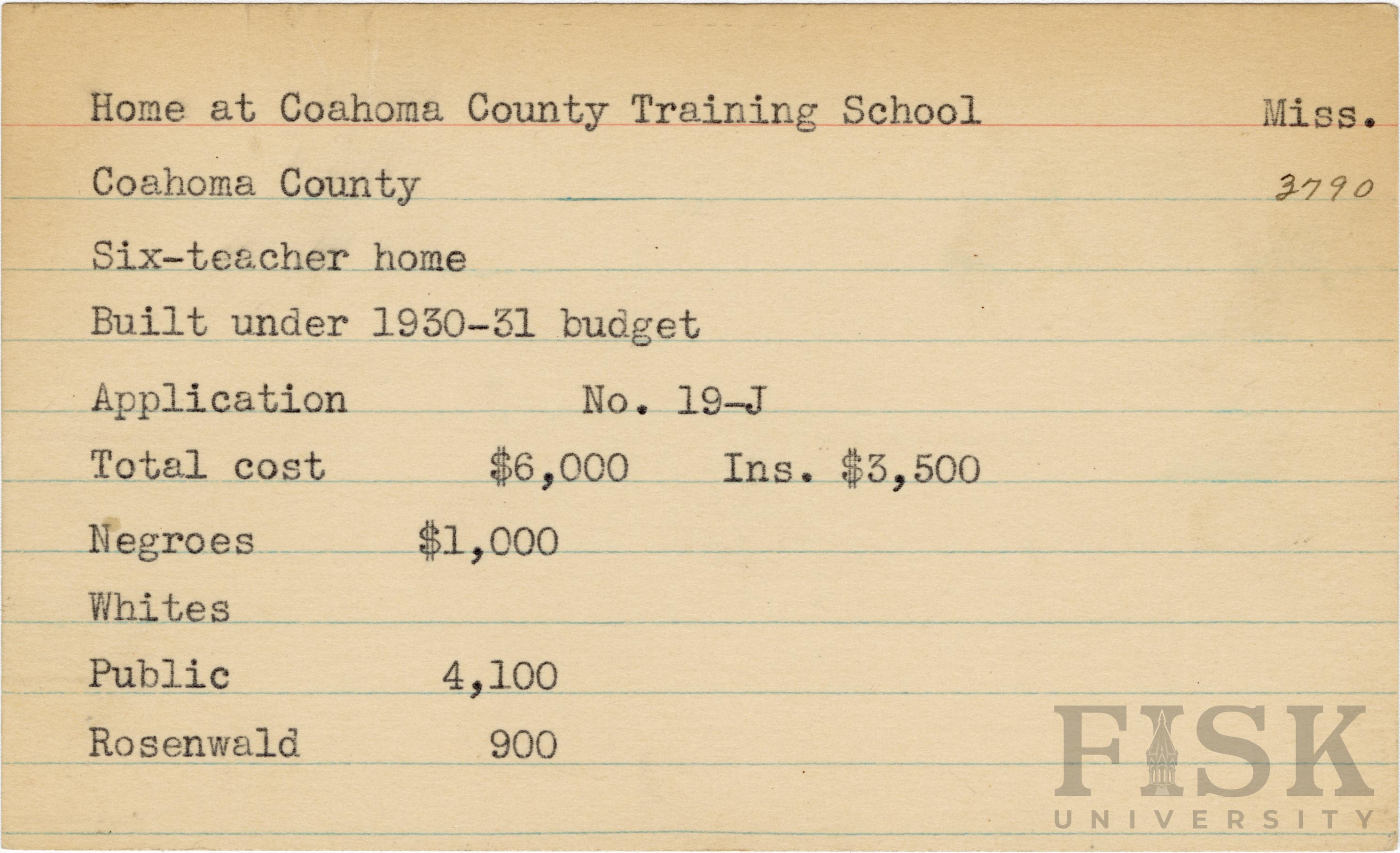 - School card from Rosenwald Fund for the six room teacher's home at County Training School in Coahoma County, Mississippi with a section added to the budget contributions that says, "Ins. $3,500"