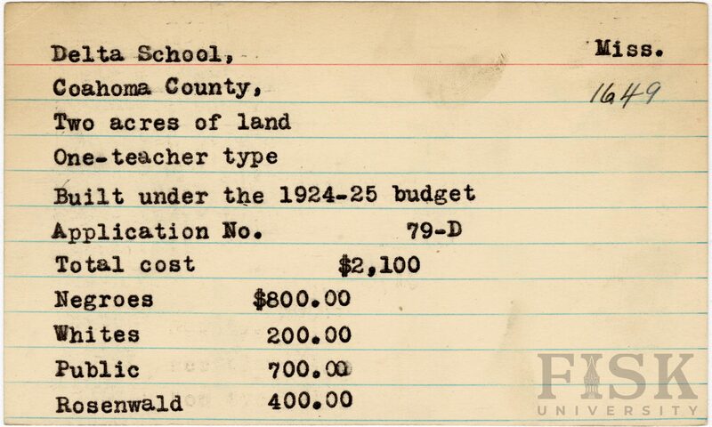 - School card from Rosenwald Fund for Delta School in Coahoma County, Mississippi