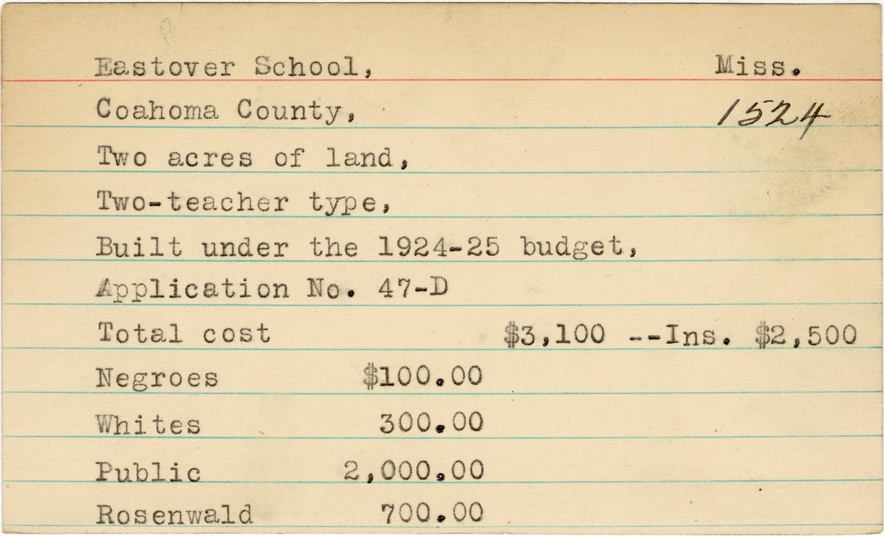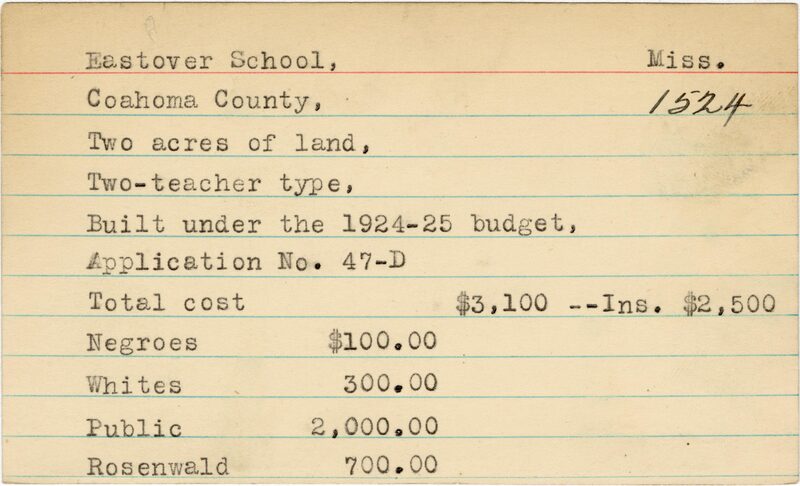 - School card from Rosenwald Fund for Eastover School in Coahoma County, Mississippi with a section added to the budget contributions that says, "Ins. $2,500"