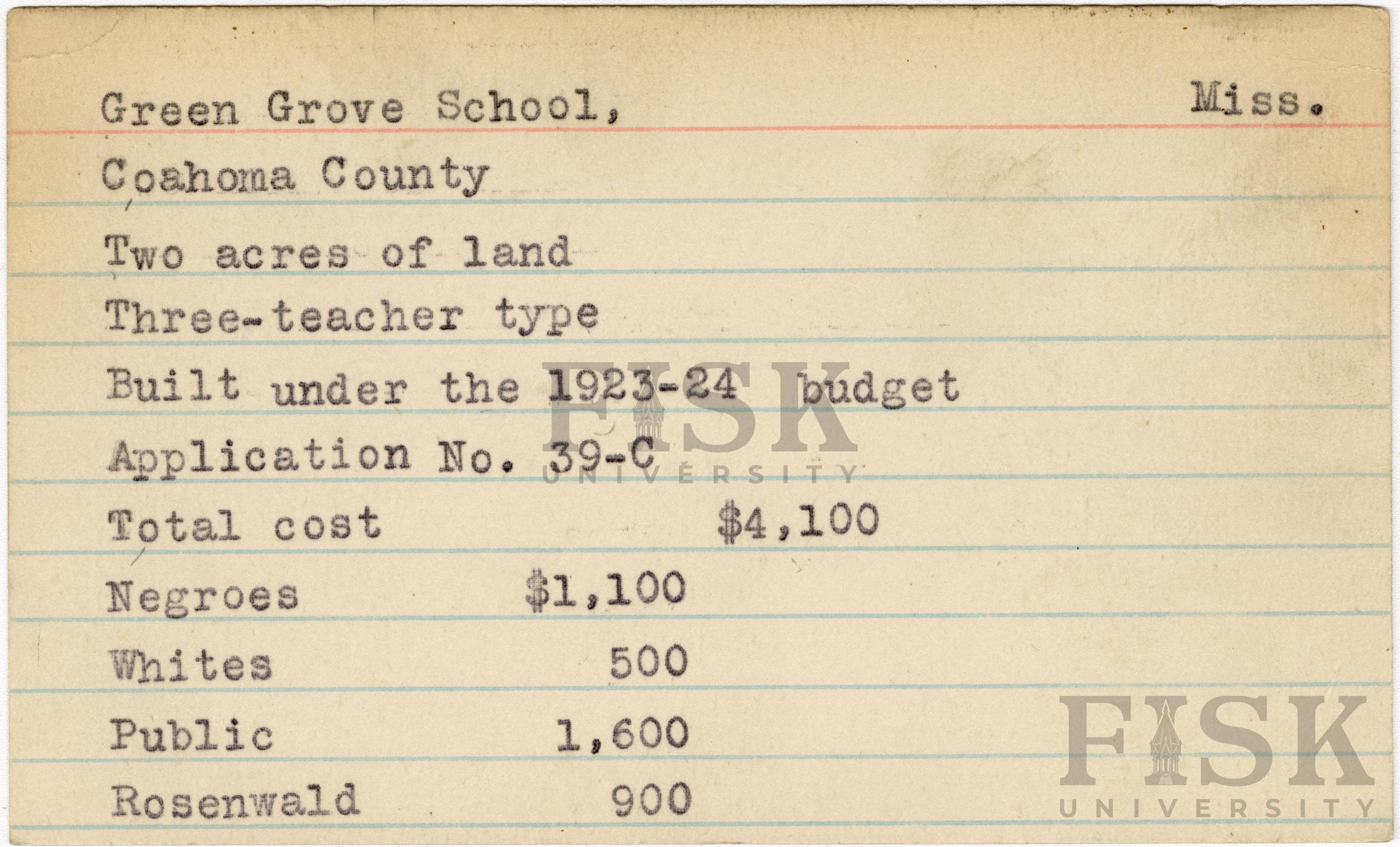 - School card from Rosenwald Fund for Green Grove School in Coahoma County, Mississippi
