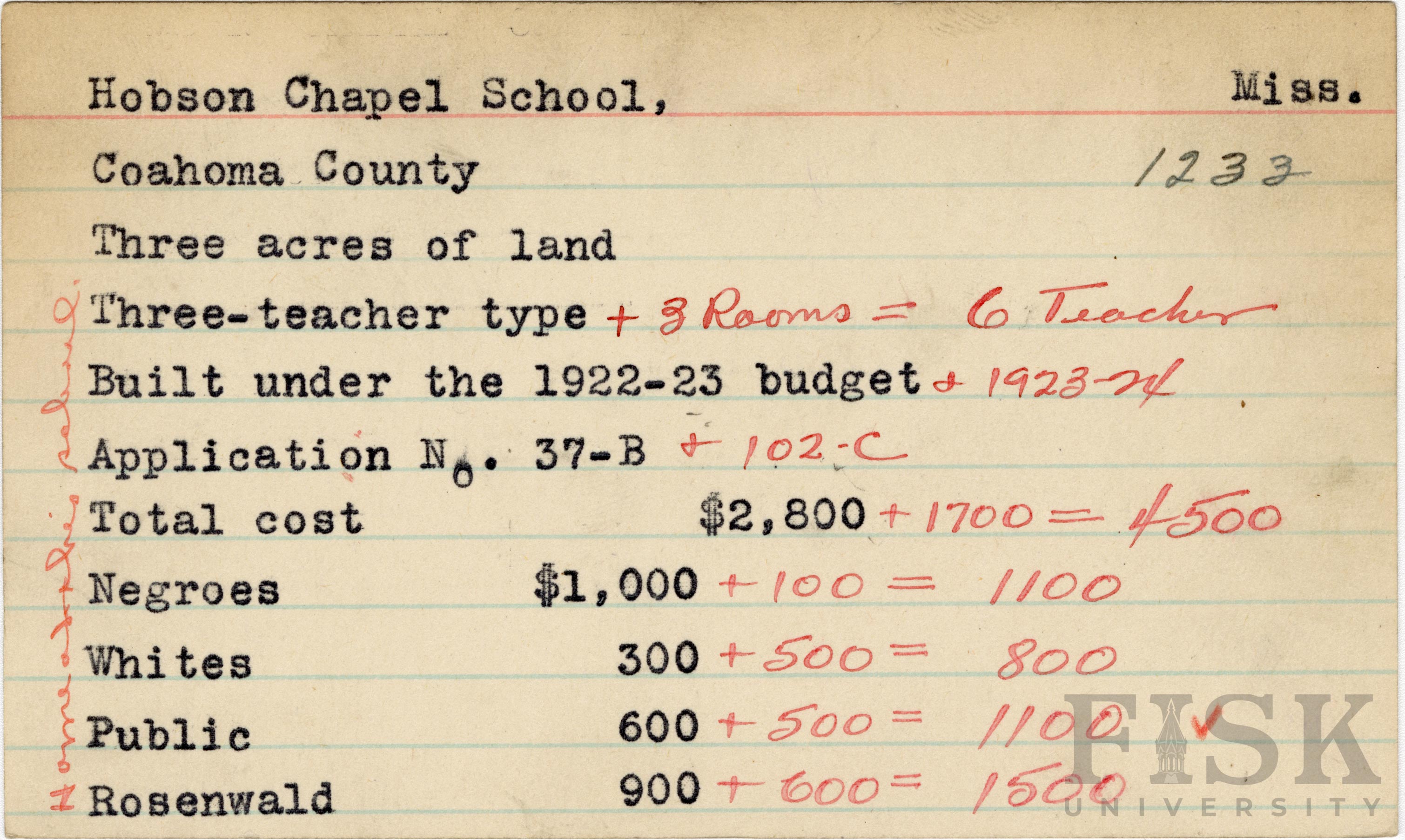 - School card from Rosenwald Fund for Hobson Chapel School in Coahoma County, Mississippi with handwritten additions to the teacher type, budget year, application number, and budget contribution sections. A handwritten note on the far left of the card says, "home at this school."