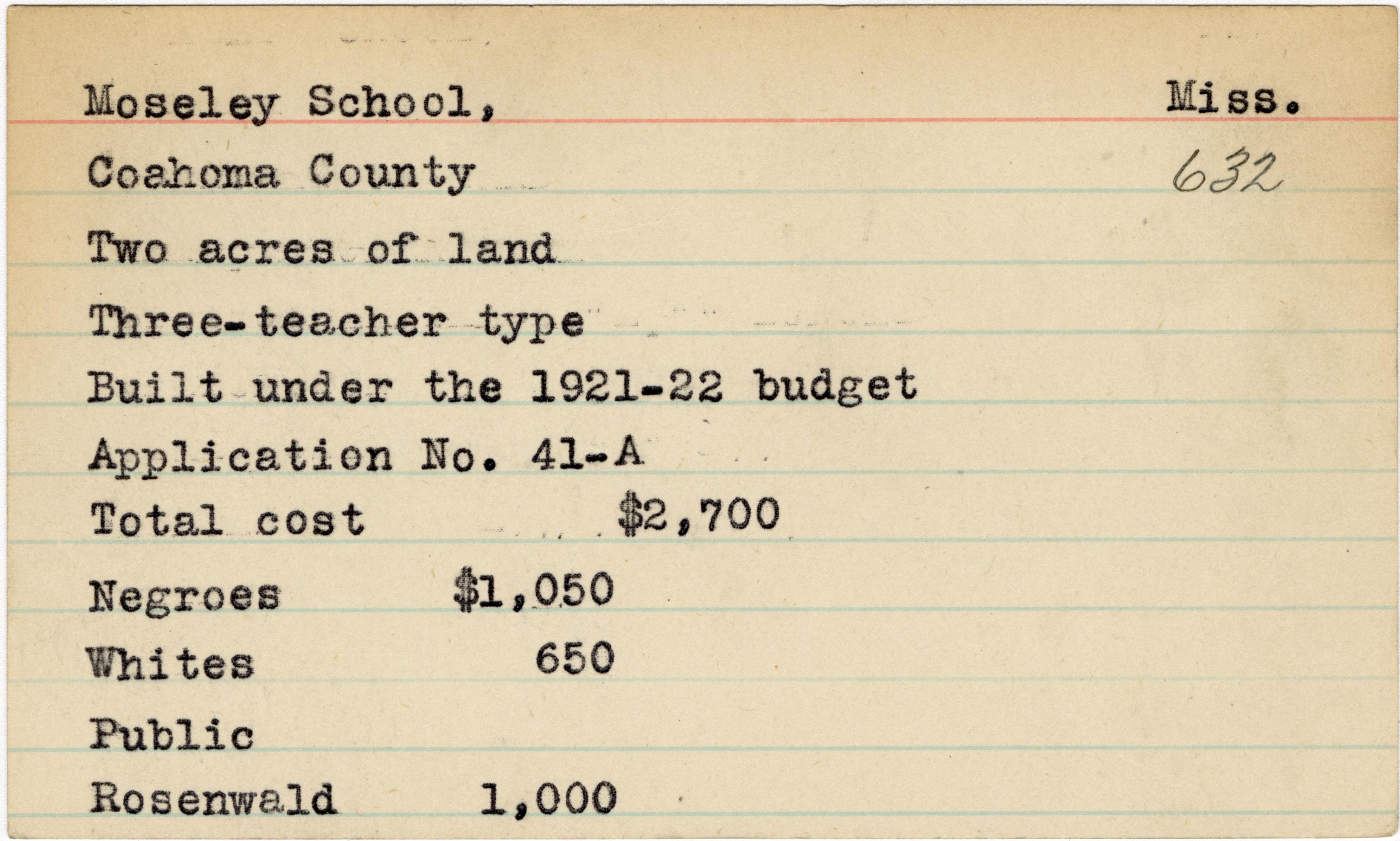 - School card from Rosenwald Fund for Moseley School in Coahoma County, Mississippi