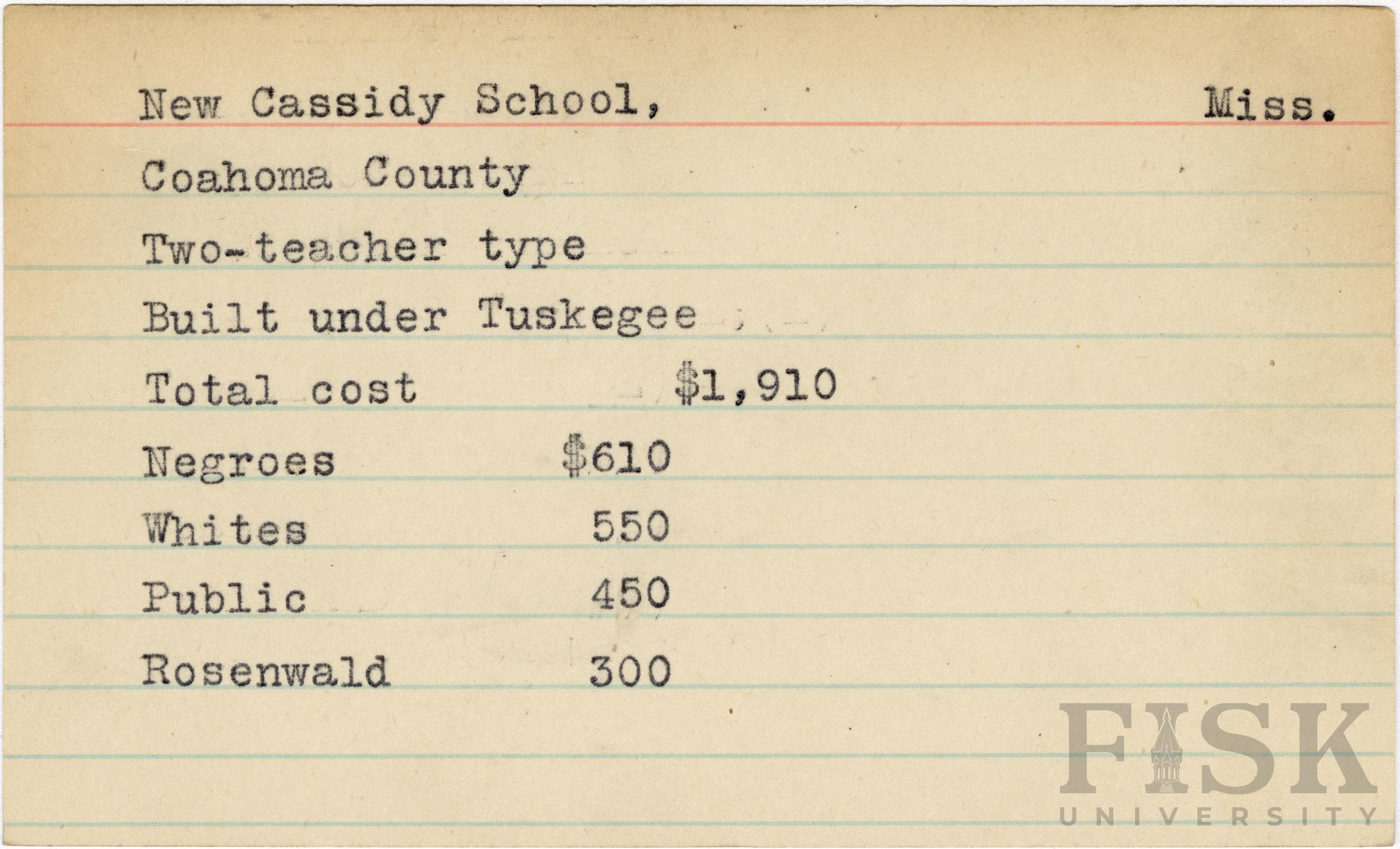 - School card from Rosenwald Fund for New Cassidy School in Coahoma County, Mississippi