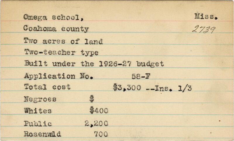 - School card from Rosenwald Fund for Omega School in Coahoma County, Mississippi with a section added to the budget contributions that says, "Ins. 1/3"