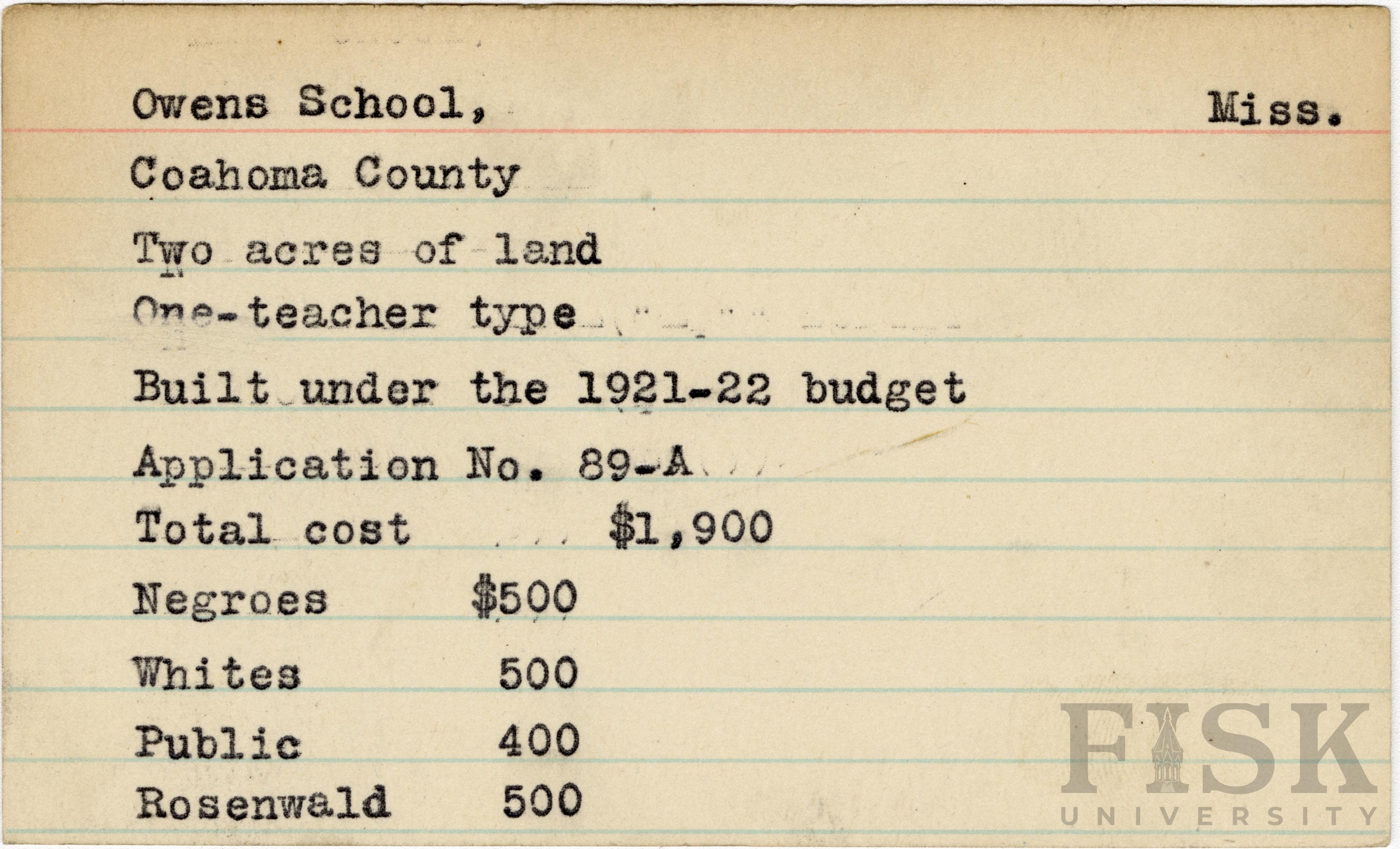 - School card from Rosenwald Fund for Owens School in Coahoma County, Mississippi