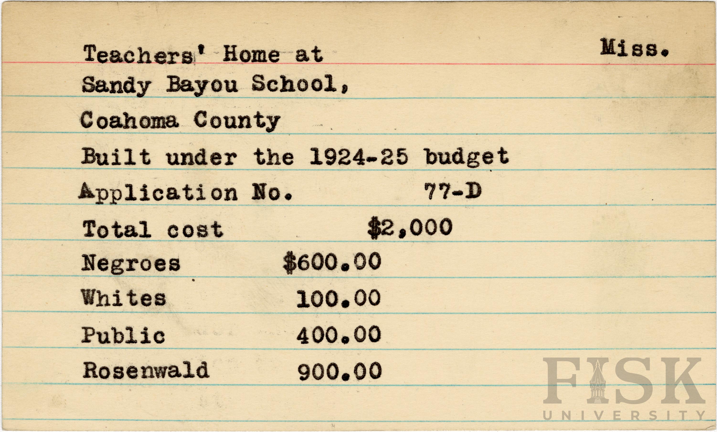 - School card from Rosenwald Fund for the teacher's home at Sandy Bayou School in Coahoma County, Mississippi