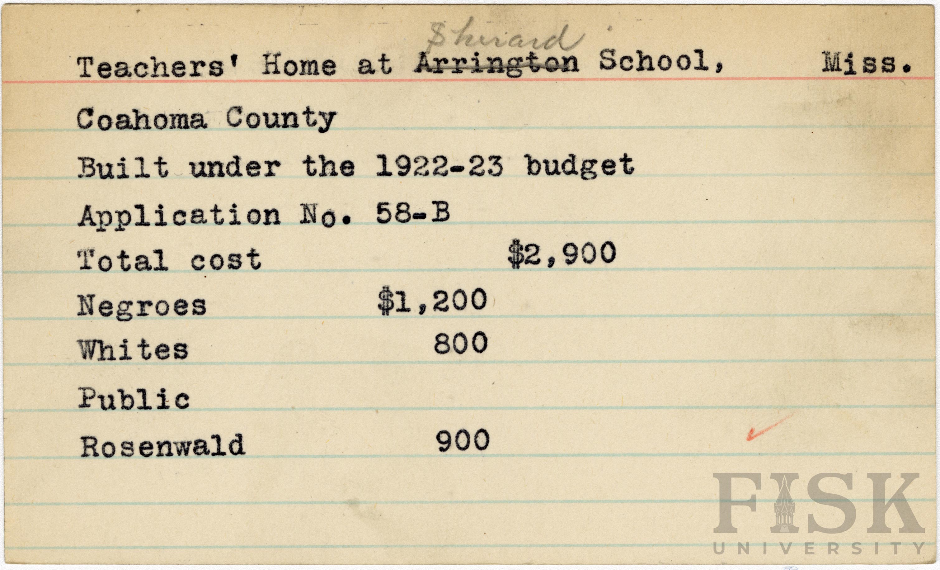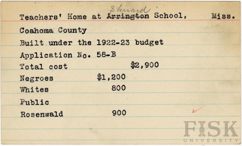 - School card from Rosenwald Fund for the teacher's home at Sherard School in Coahoma County, Mississippi