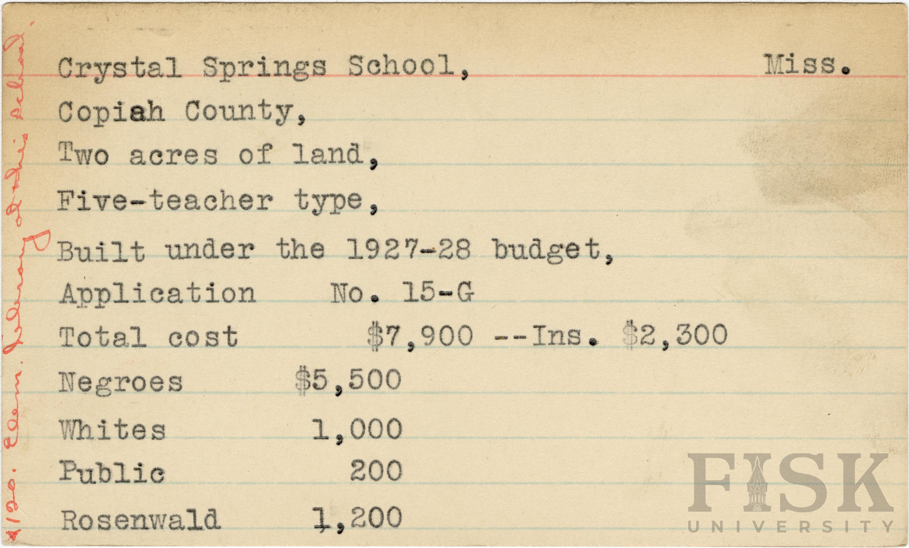 - School card from Rosenwald Fund for Crystal Springs School in Copiah County, Mississippi with a section added to the budget contributions that says, "Ins. $2,300" and a handwritten note on the far left of the card that says, "$120 elem library at this school"