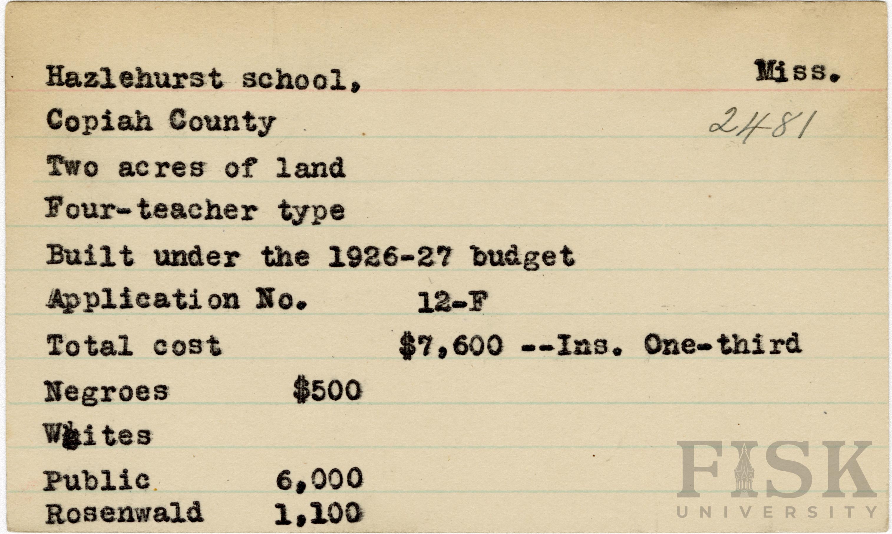 - School card from Rosenwald Fund for Hazlehurst School in Copiah County, Mississippi with a section added to the budget contributions that says, "Ins. One-third"