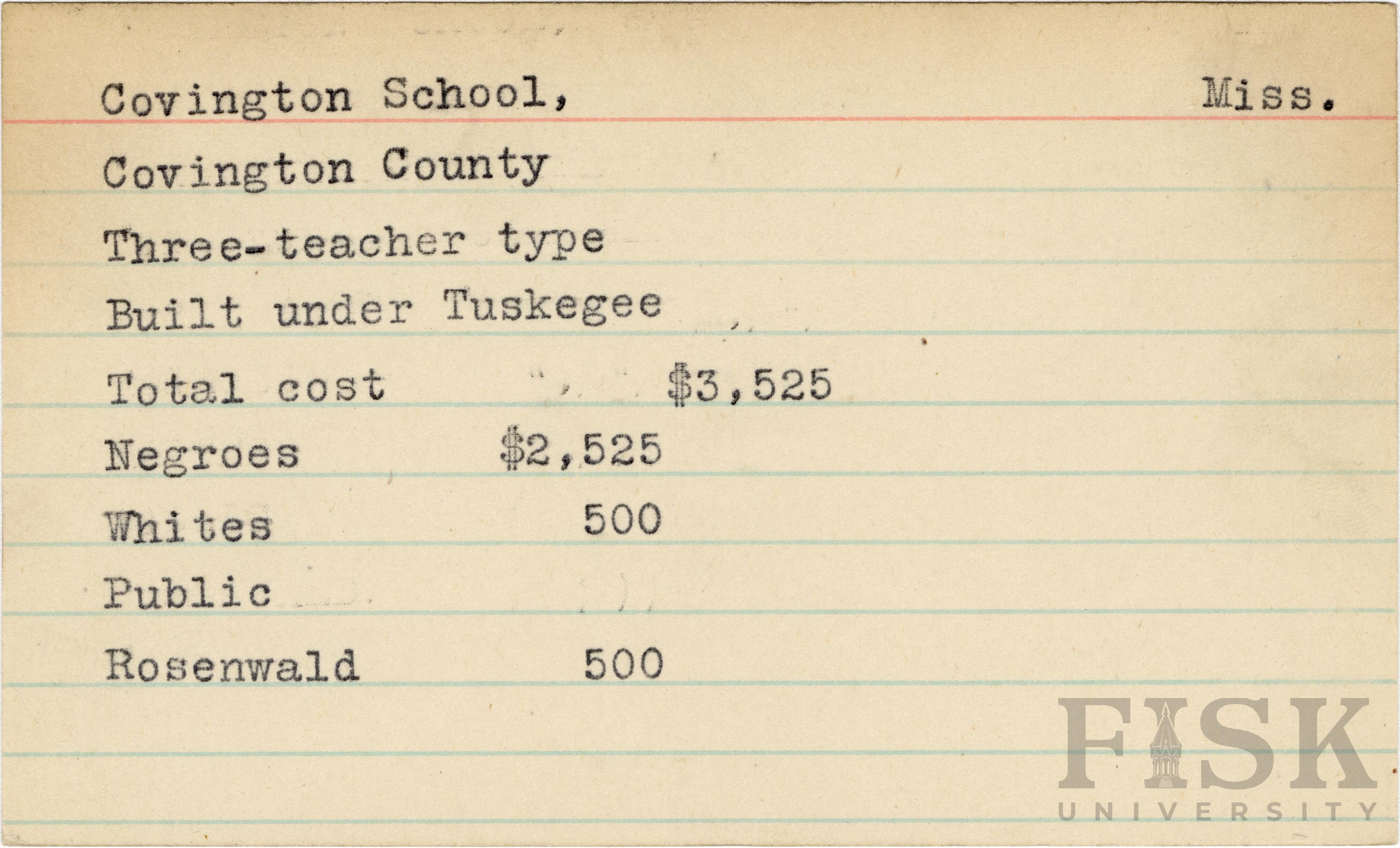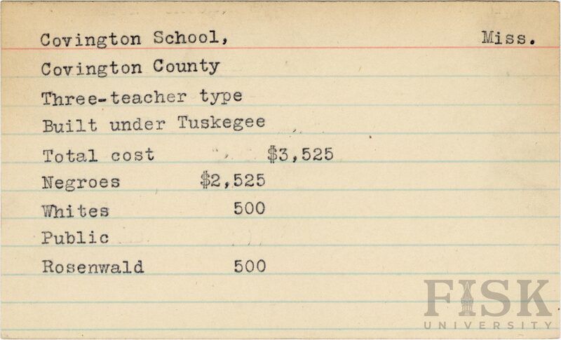 - School card from Rosenwald Fund for Covington School in Covington County, Mississippi