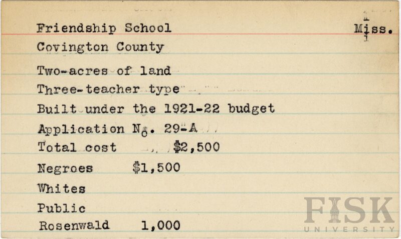- School card from Rosenwald Fund for Friendship School in Covington County, Mississippi