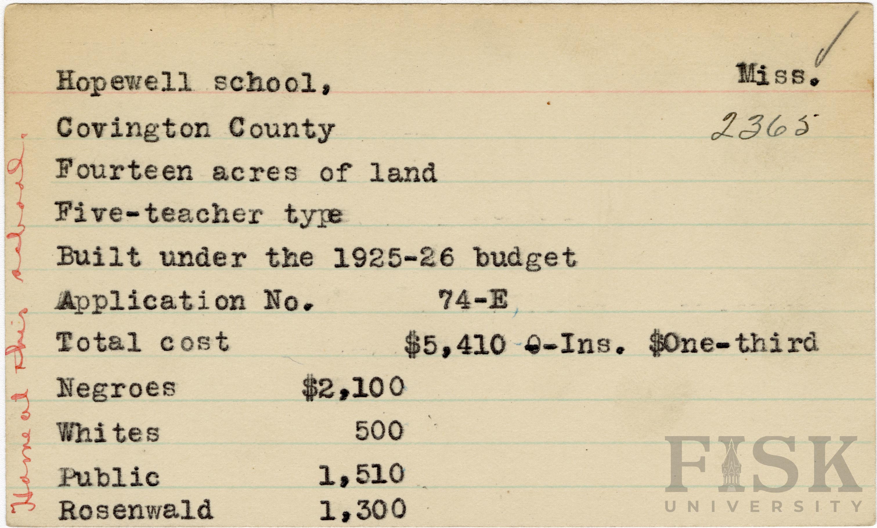 - School card from Rosenwald Fund for Hopewell School in Covington County, Mississippi with a section added to the budget contributions that says, "Ins. $One-third" and handwritten note on the far left of the card that says, "home at this school"