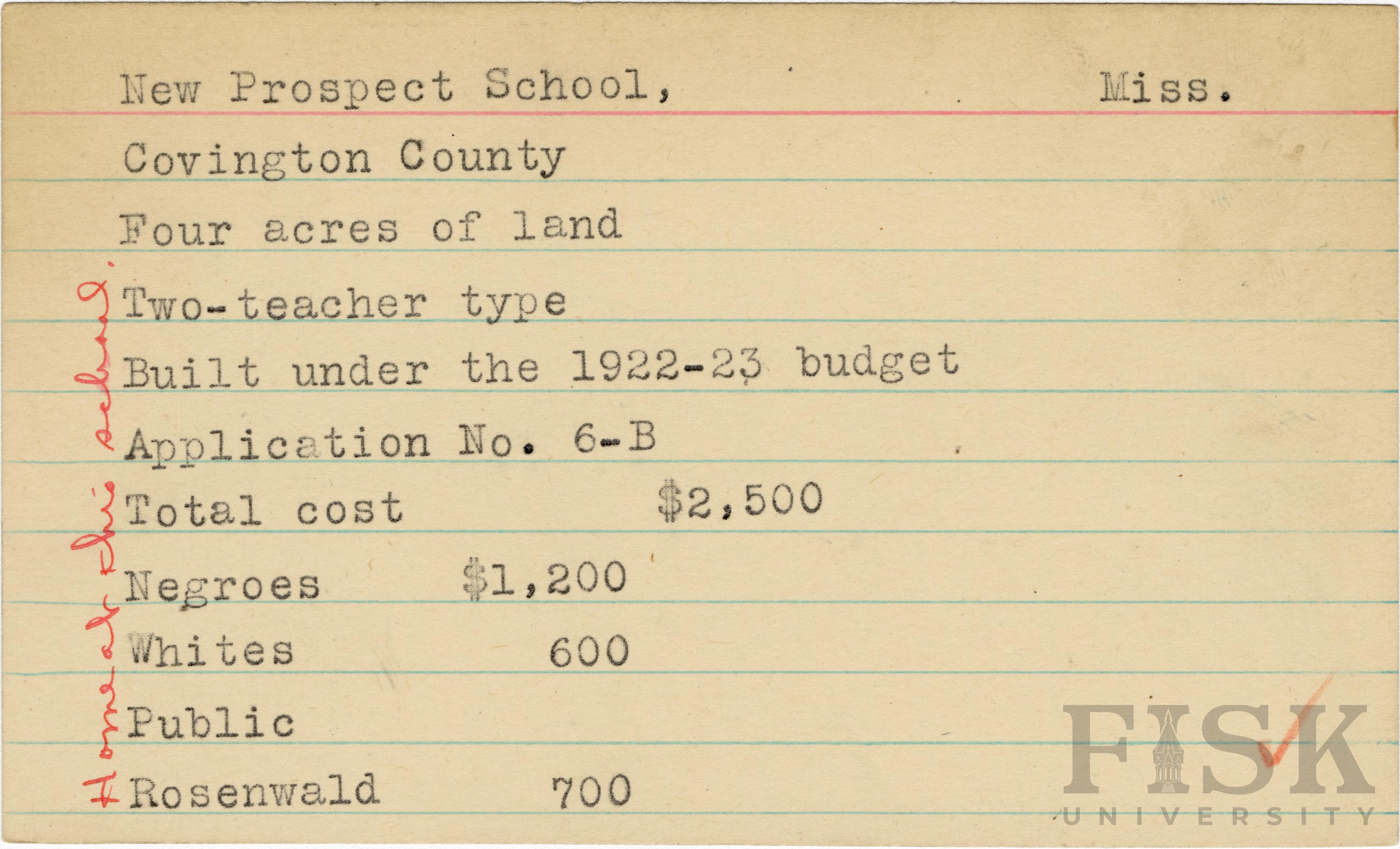 - School card from Rosenwald Fund for New Prospect School in Covington County, Mississippi with a handwritten note on the far left of the card that says, "Home at this school"