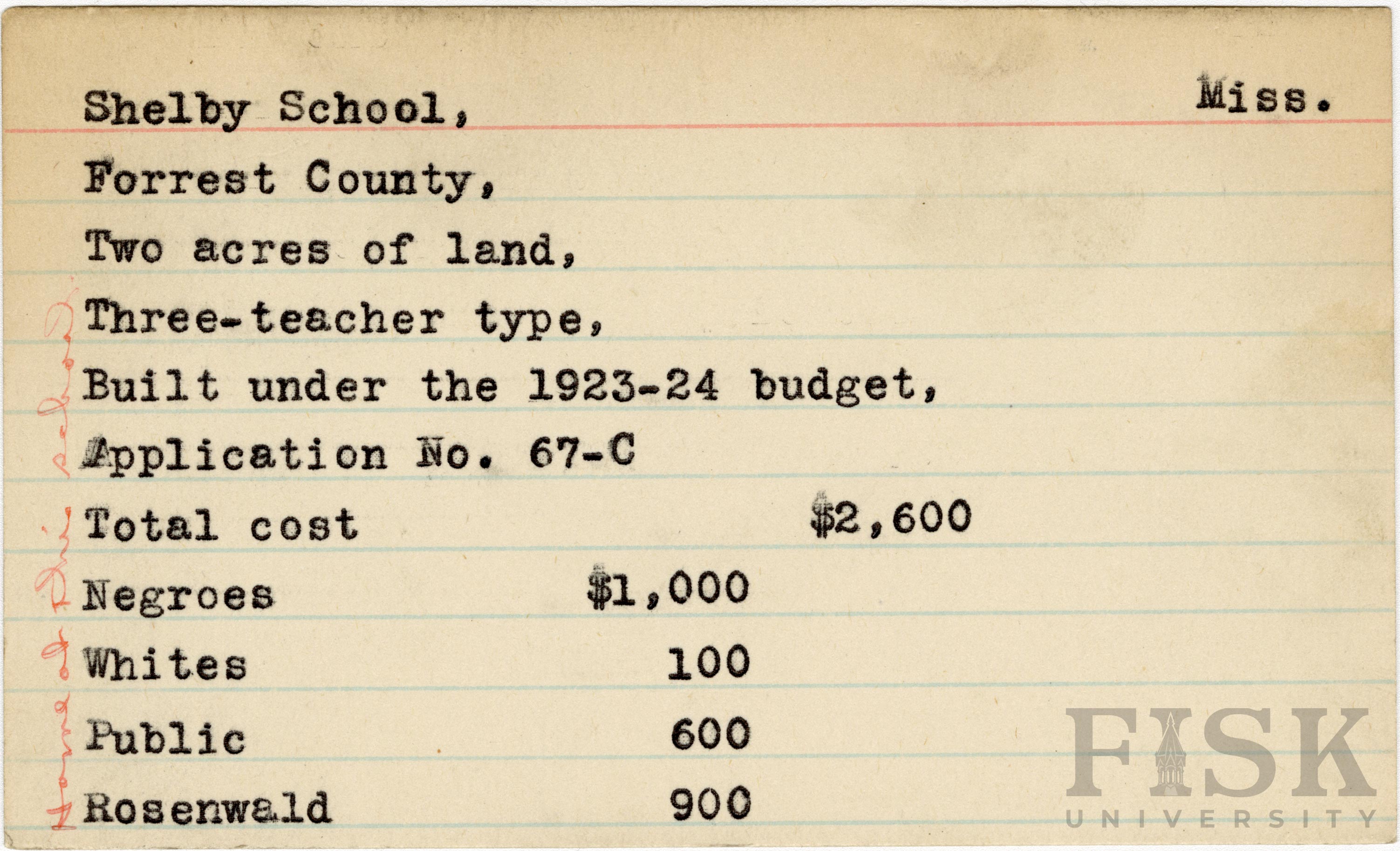 - School card from Rosenwald Fund for Shelby School in Forrest County, Mississippi with a handwritten note on the far left of the card that says, "home at this school"
