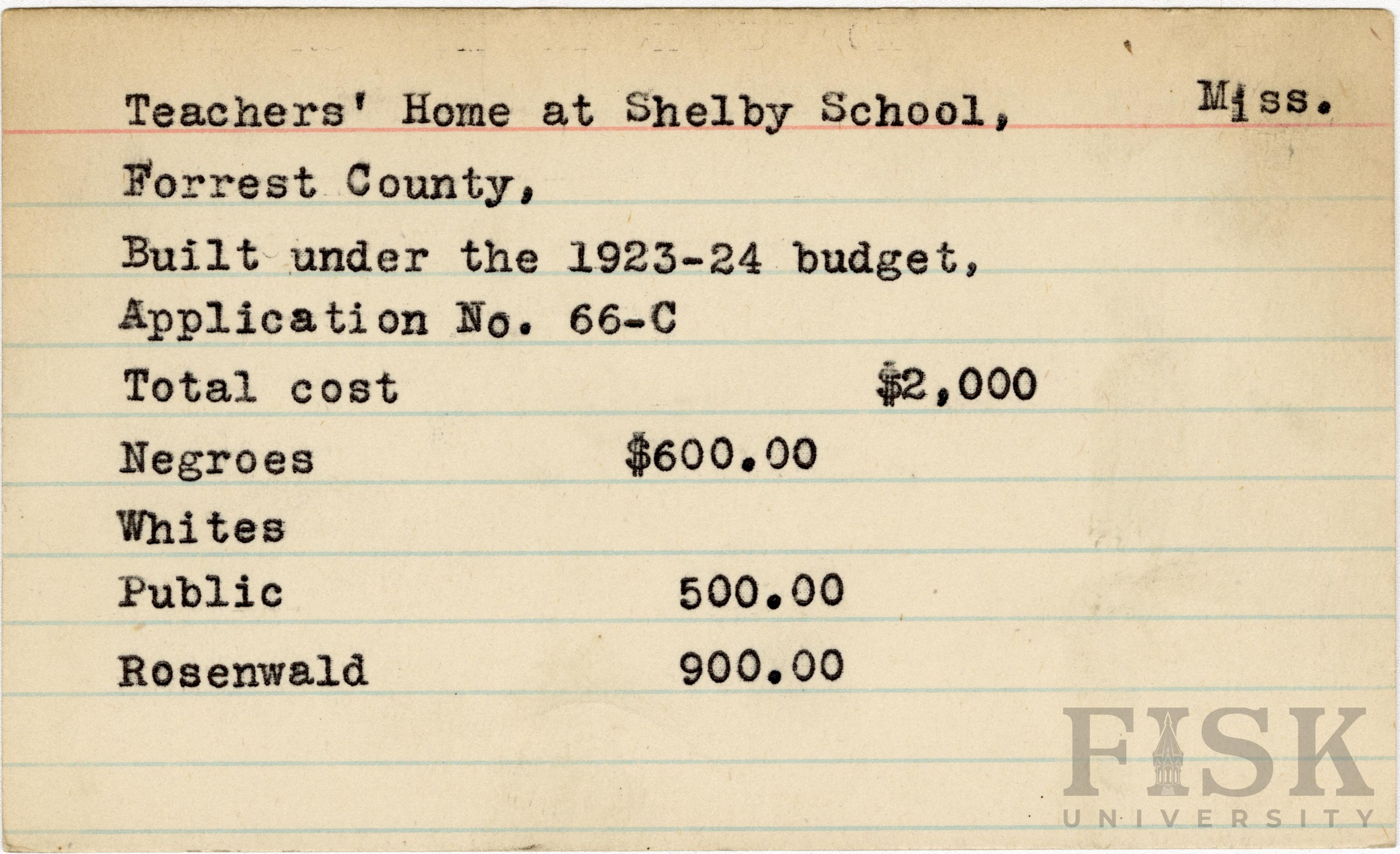 - School card from Rosenwald Fund for the teacher's home at Shelby School in Forrest County, Mississippi