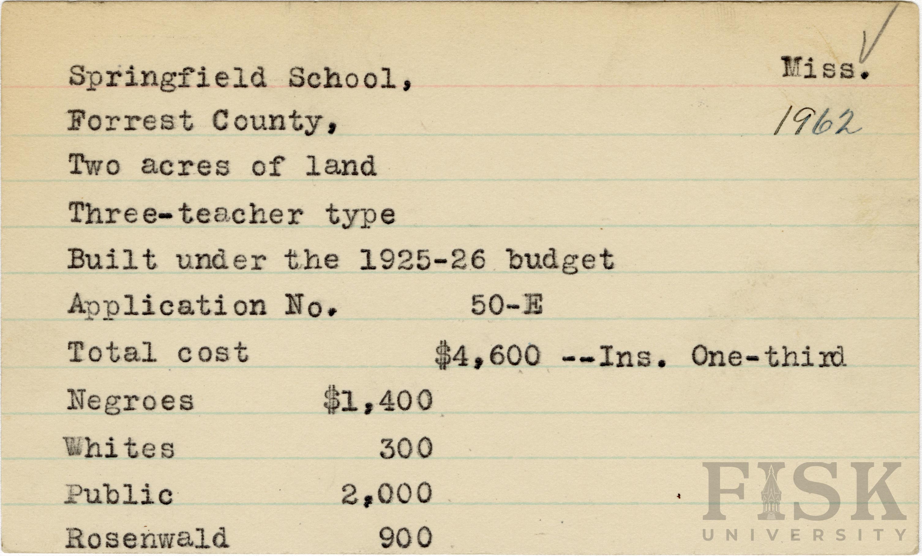 - School card from Rosenwald Fund for Springfield School in Forrest County, Mississippi with a section added to the budget contributions that says, "Ins. One-third"