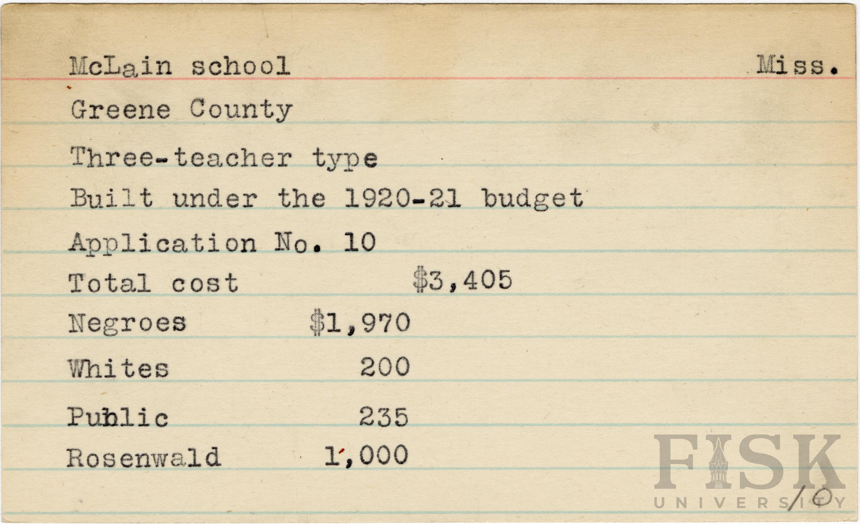 - School card from Rosenwald Fund for McLain School in Greene County, Mississippi