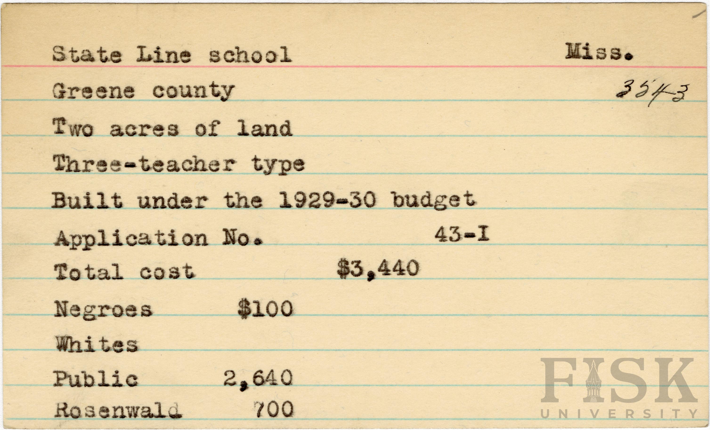 - School card from Rosenwald Fund for State Line School in Greene County, Mississippi