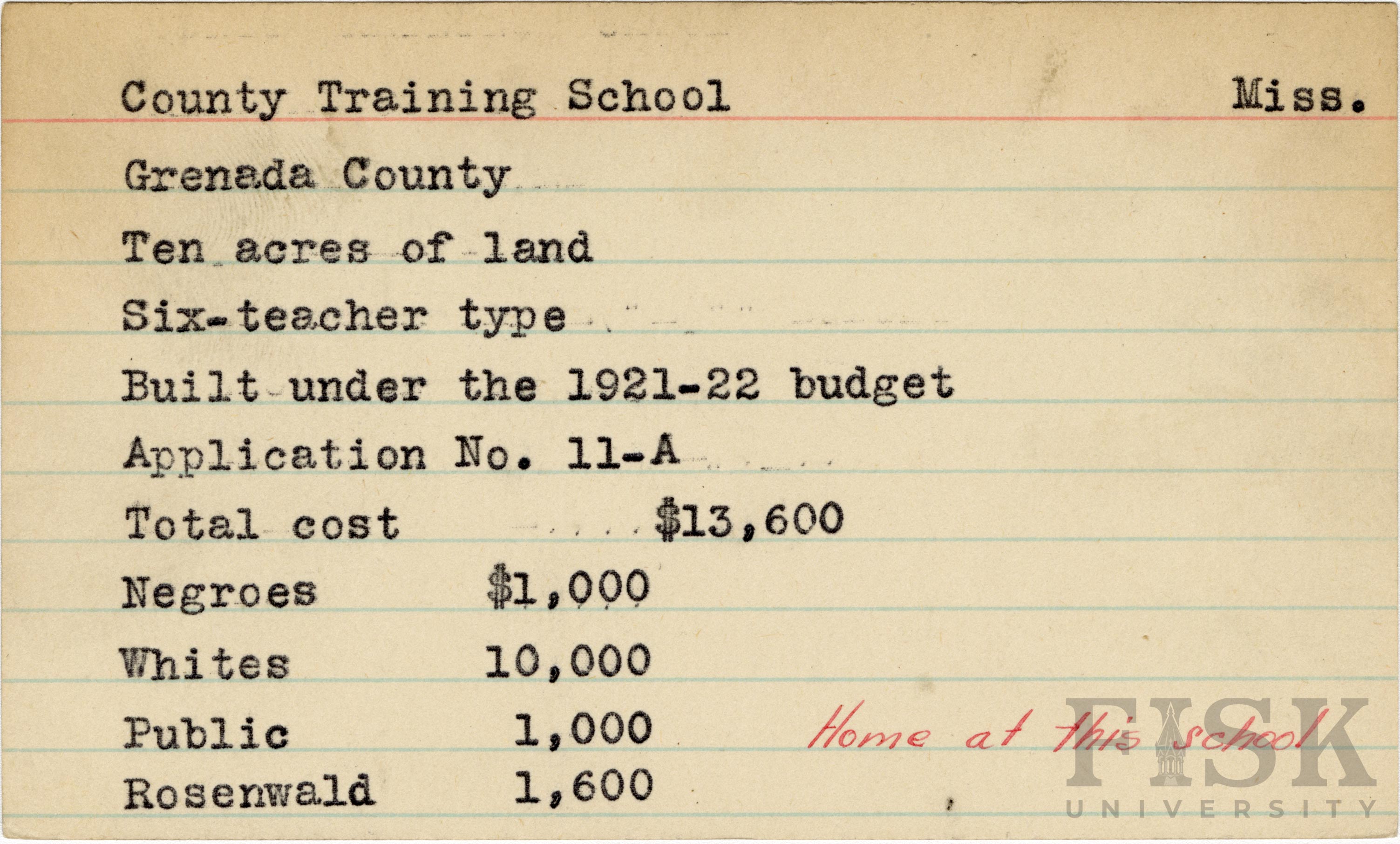 - School card from Rosenwald Fund for County Training School in Grenada County, Mississippi with a handwritten note that says, "home at this school"